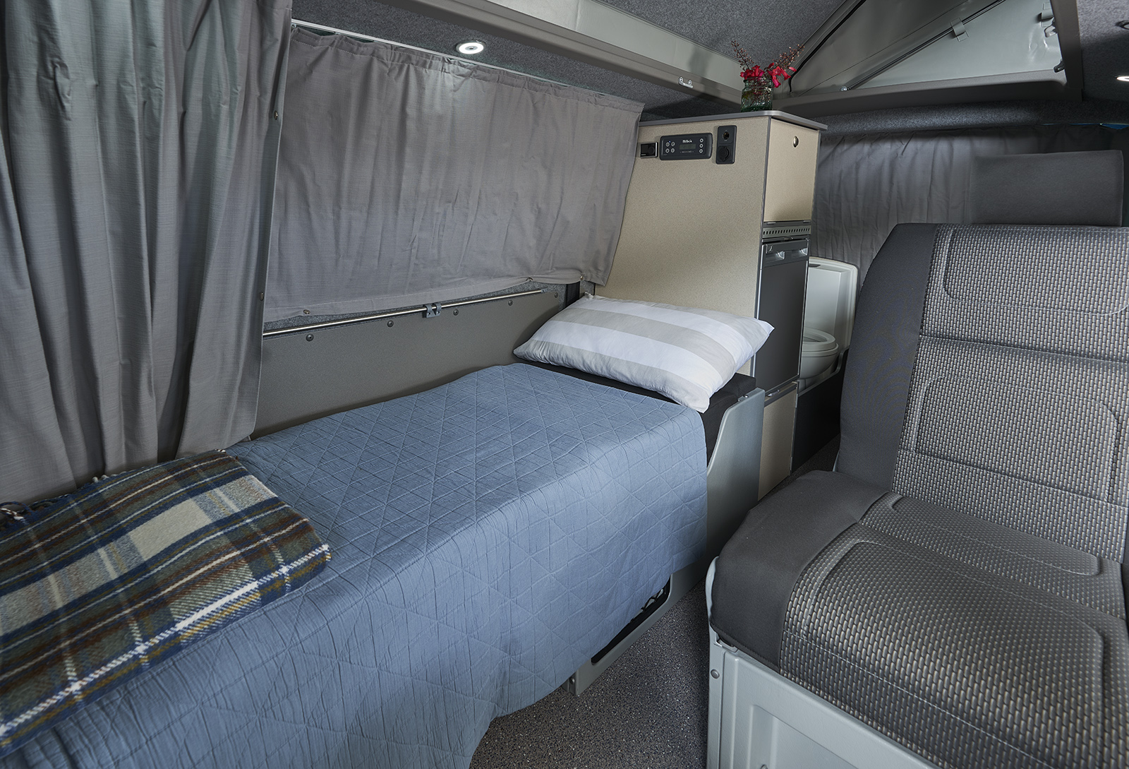This conversion allows two people to sleep comfortably in single beds, utilising the rear and front swivel seats which link together to create the sleeping area, leaving space in between allowing for easy access to the kitchen or toilet area when needed. It has an option to turn the single beds into a double and you can specify a roof bed as well.