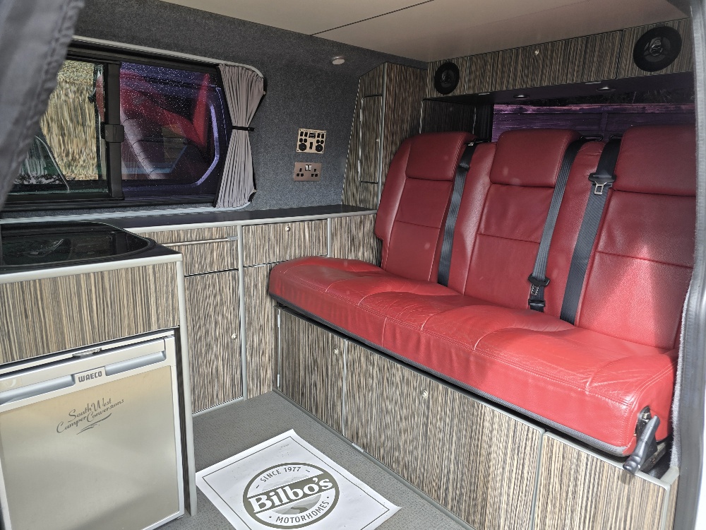 A traditional layout with units fitted down one side including a 2-burner hob, compressor fridge, sink , mains hook up, leisure battery and storage lockers throughout. The rear bench seat carries 3 rear passengers with 3-point seat belts and makes quickly into a double bed, again with storage beneath.