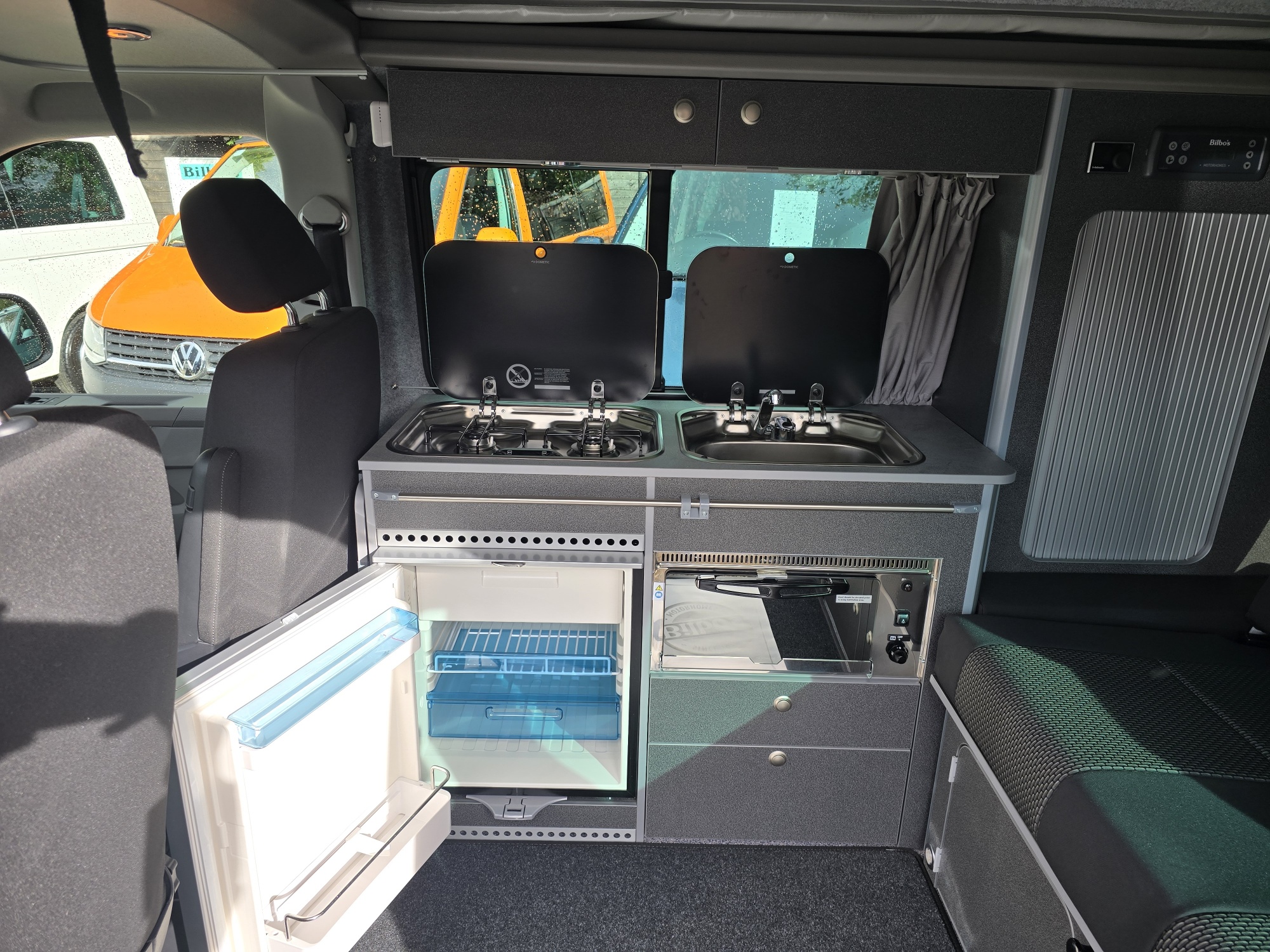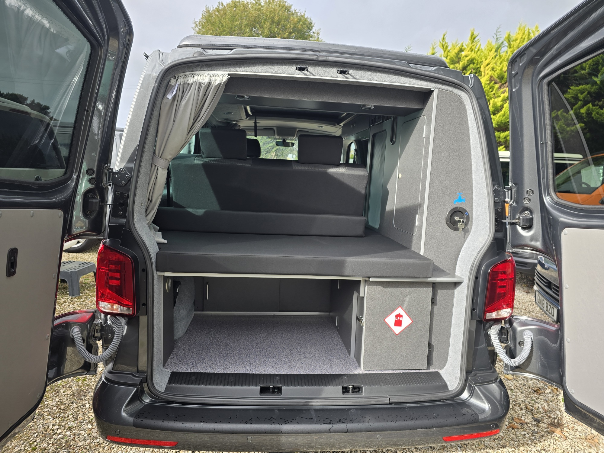 A low mileage 'as new' example this is a classic style layout with side kitchen and rear bench seat making into a double bed. The kitchen includes a 65ltr compressor fridge with freezer compartment, 2-burner hob, sink, warming oven / grill, fresh & waste water tanks, leisure battery, mains hook up and storage drawers with a cutlery tray, useful mini lockers over the kitchen units, a rear wardrobe and shelving area and storage under the bed/seat unit and at the rear of the vehicle. The bench seat with head rests & seat belts makes up very quickly into a 6'3" x 4'41/2" double. Roof beds optional.