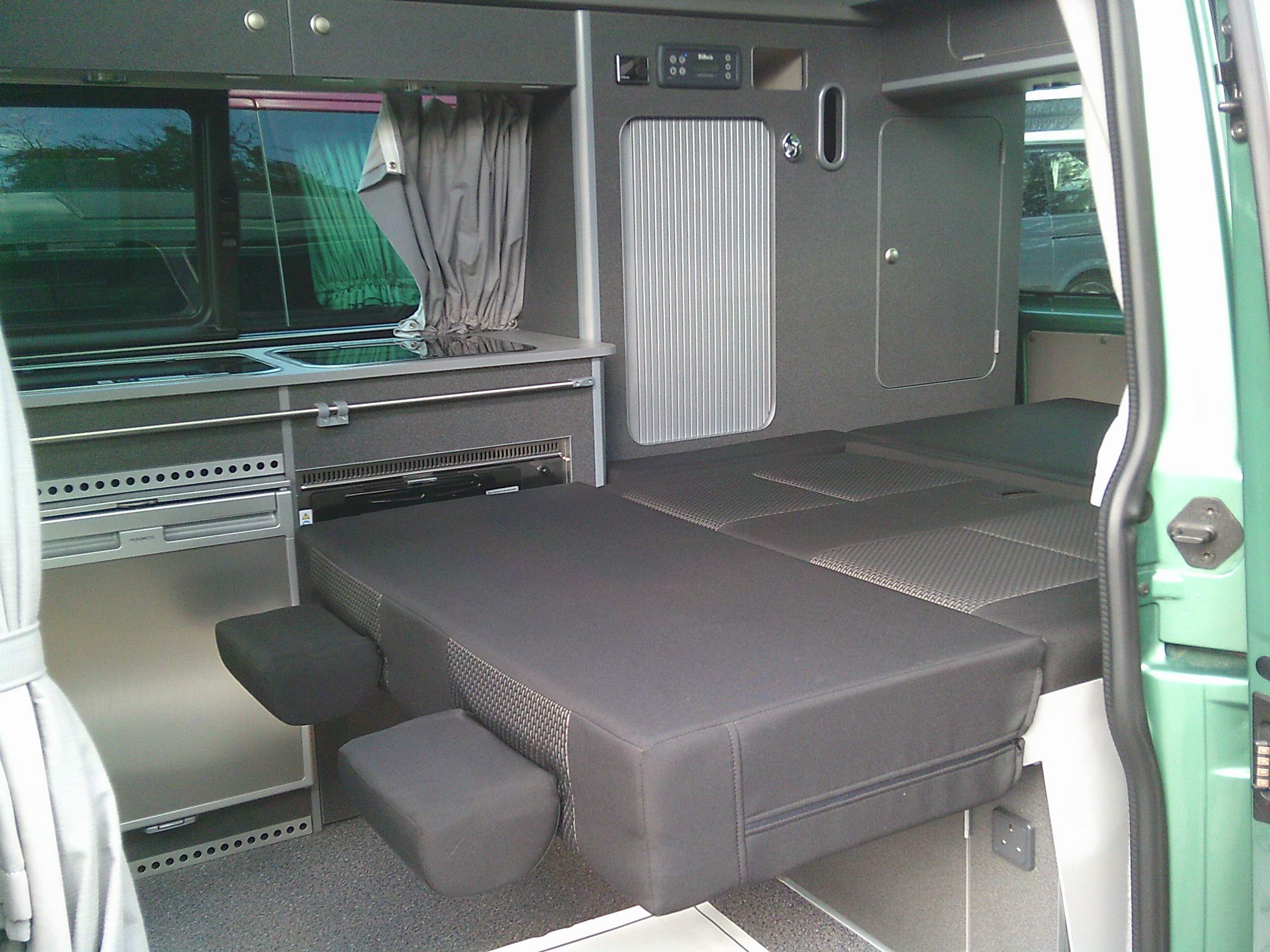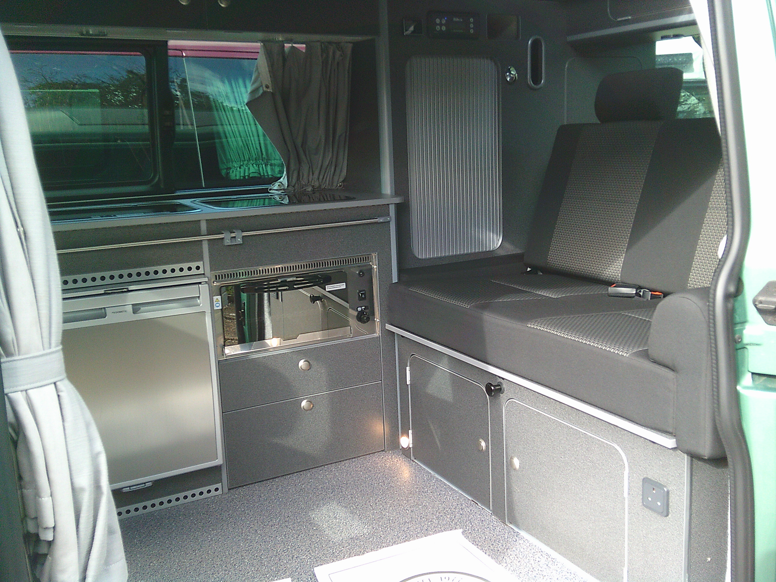 Built on the kombi base vehicle this is a classic style layout with side kitchen and rear bench seat making into a double bed. The kitchen includes a 65ltr compressor fridge with freezer compartment, 2-burner hob, sink, warming oven / grill, fresh & waste water tanks, leisure battery, mains hook up and storage drawers with a cutlery tray, useful mini lockers over the kitchen units, a rear wardrobe and shelving area and storage under the bed/seat unit and at the rear of the vehicle. The bench seat with head rests & seat belts makes up very quickly into a 6'3" x 4'41/2" double.
