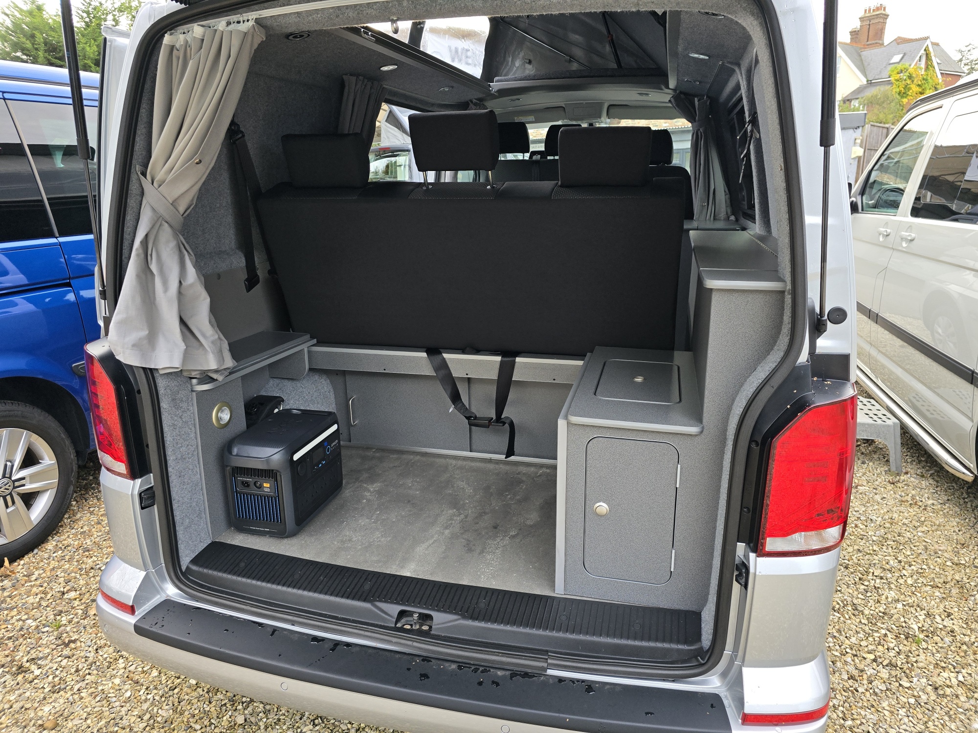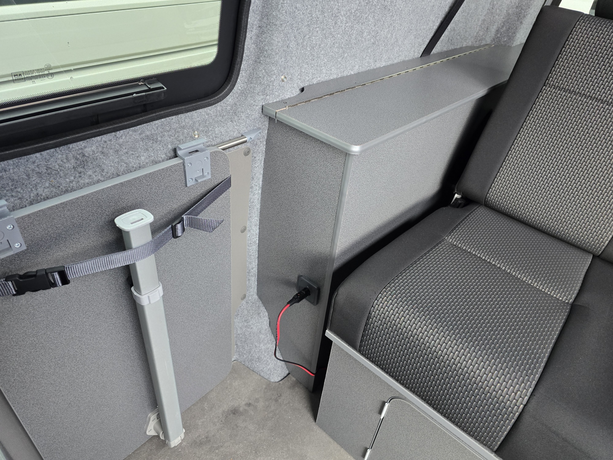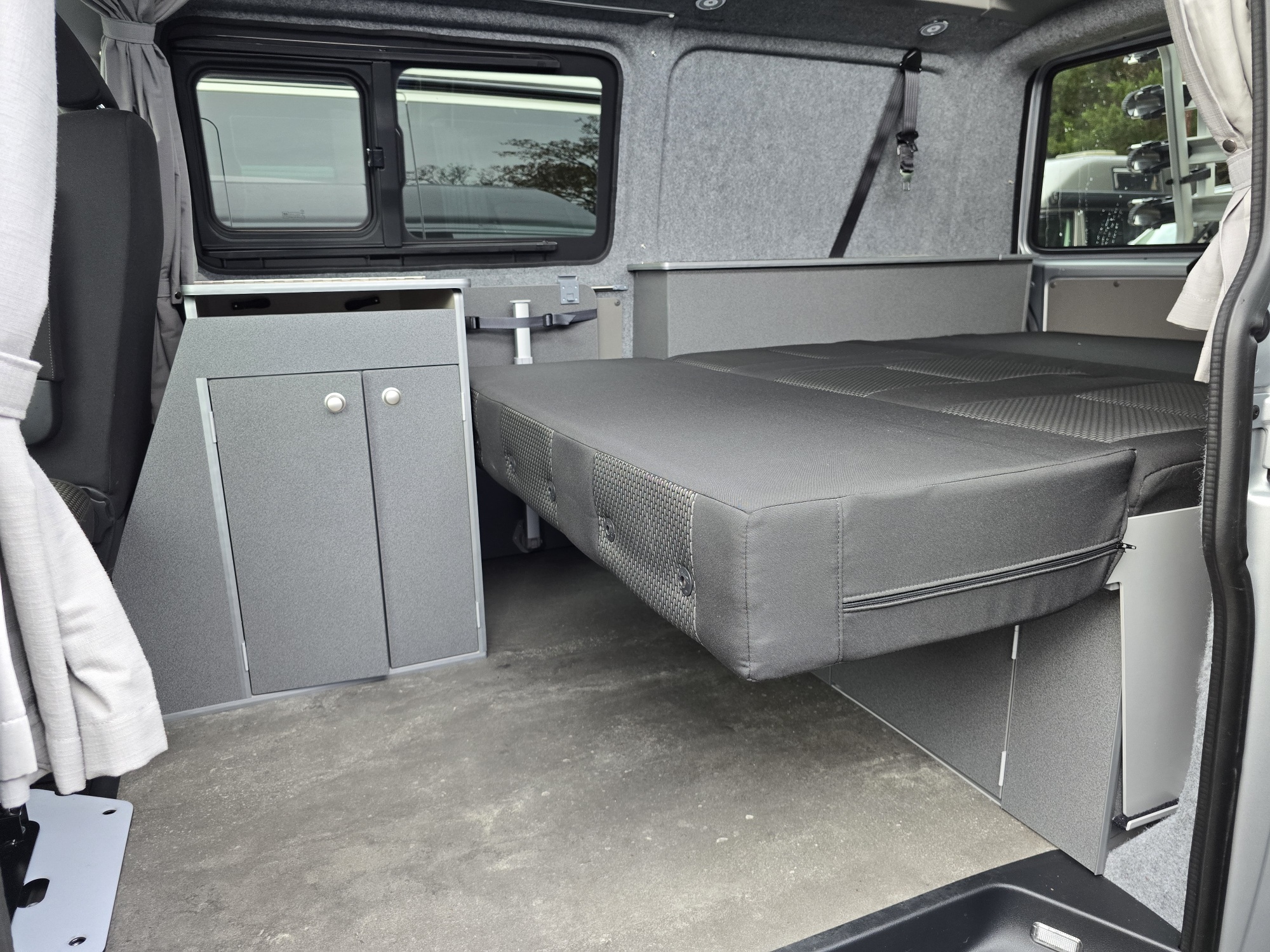 An entry level conversion with wide bed, side storage locker, LED lighting and removable storage box with an Anker power pack for the 12V electrics