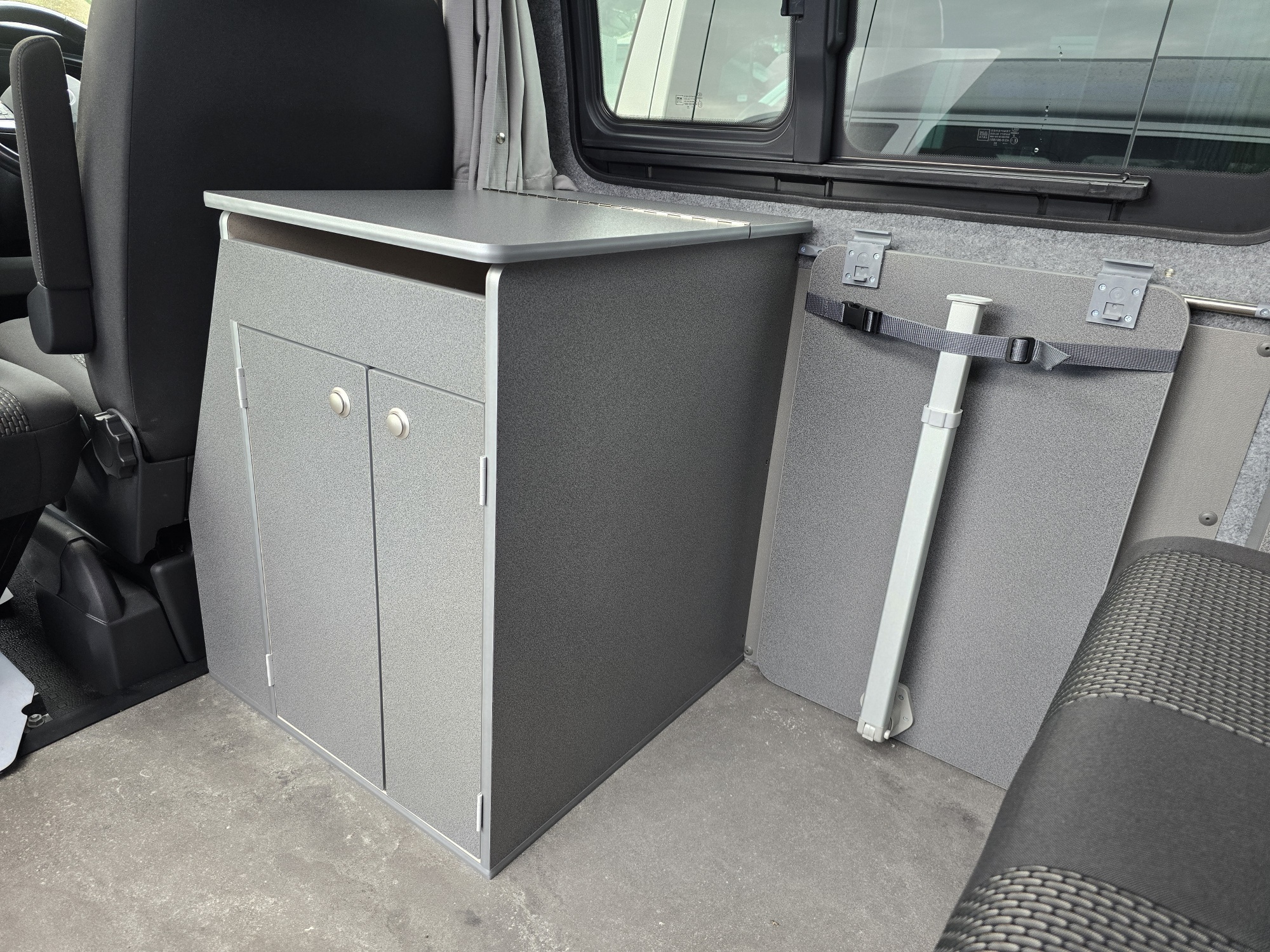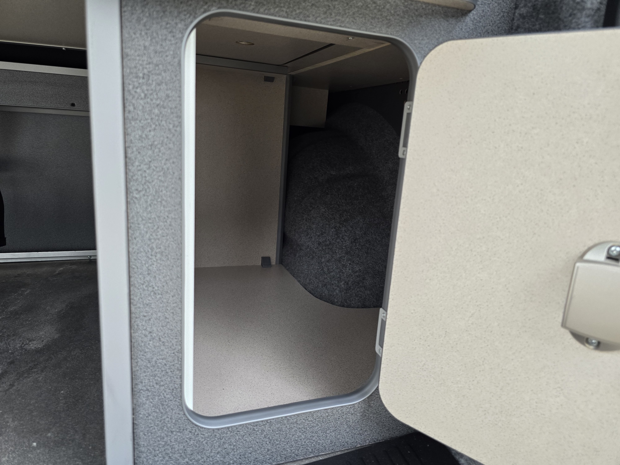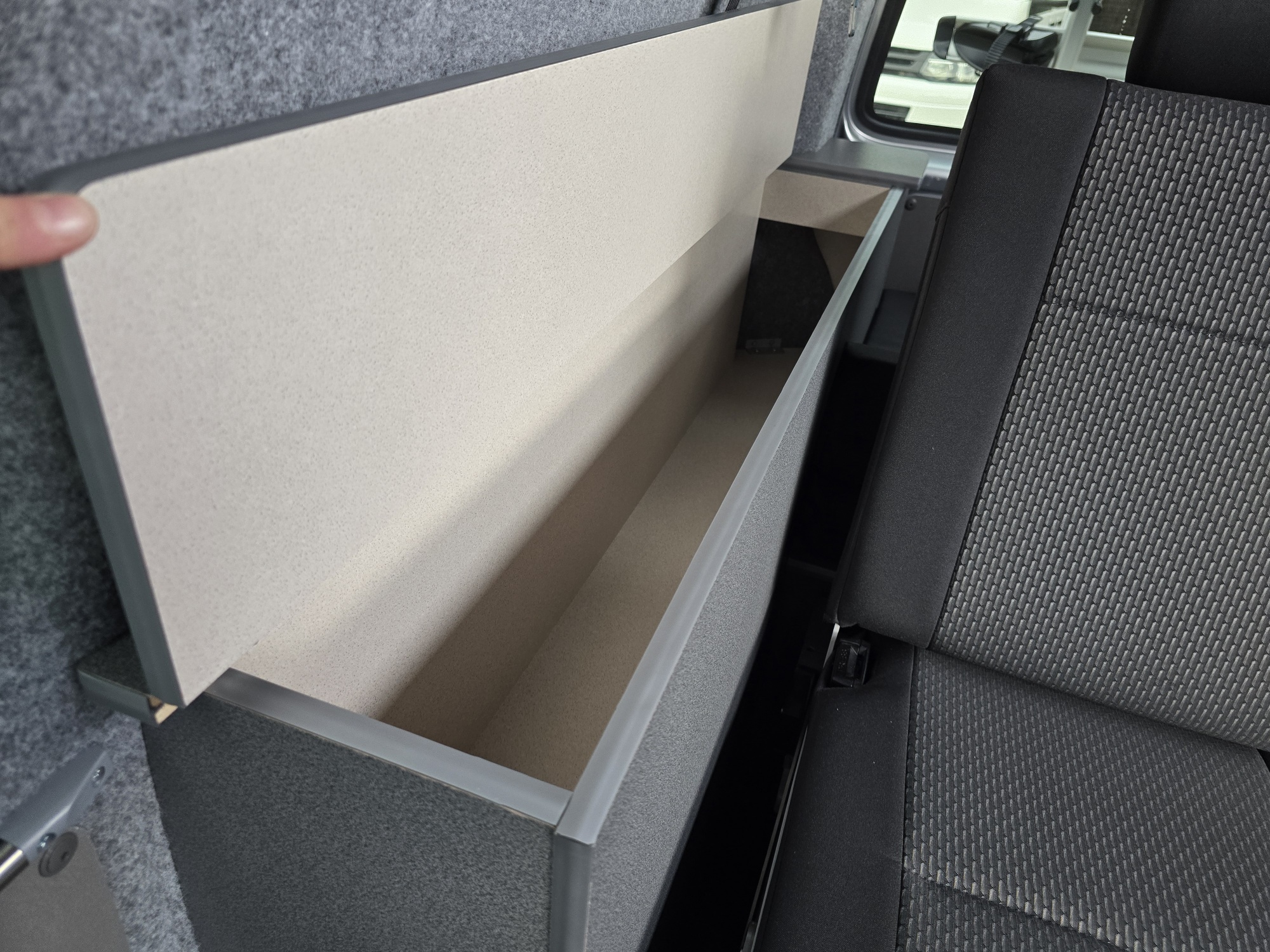An entry level conversion with wide bed, side storage locker, LED lighting and removable storage box with an Anker power pack for the 12V electrics