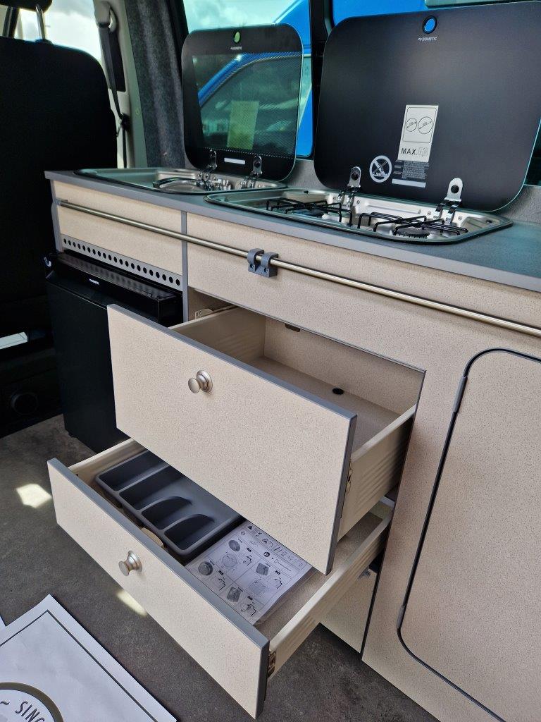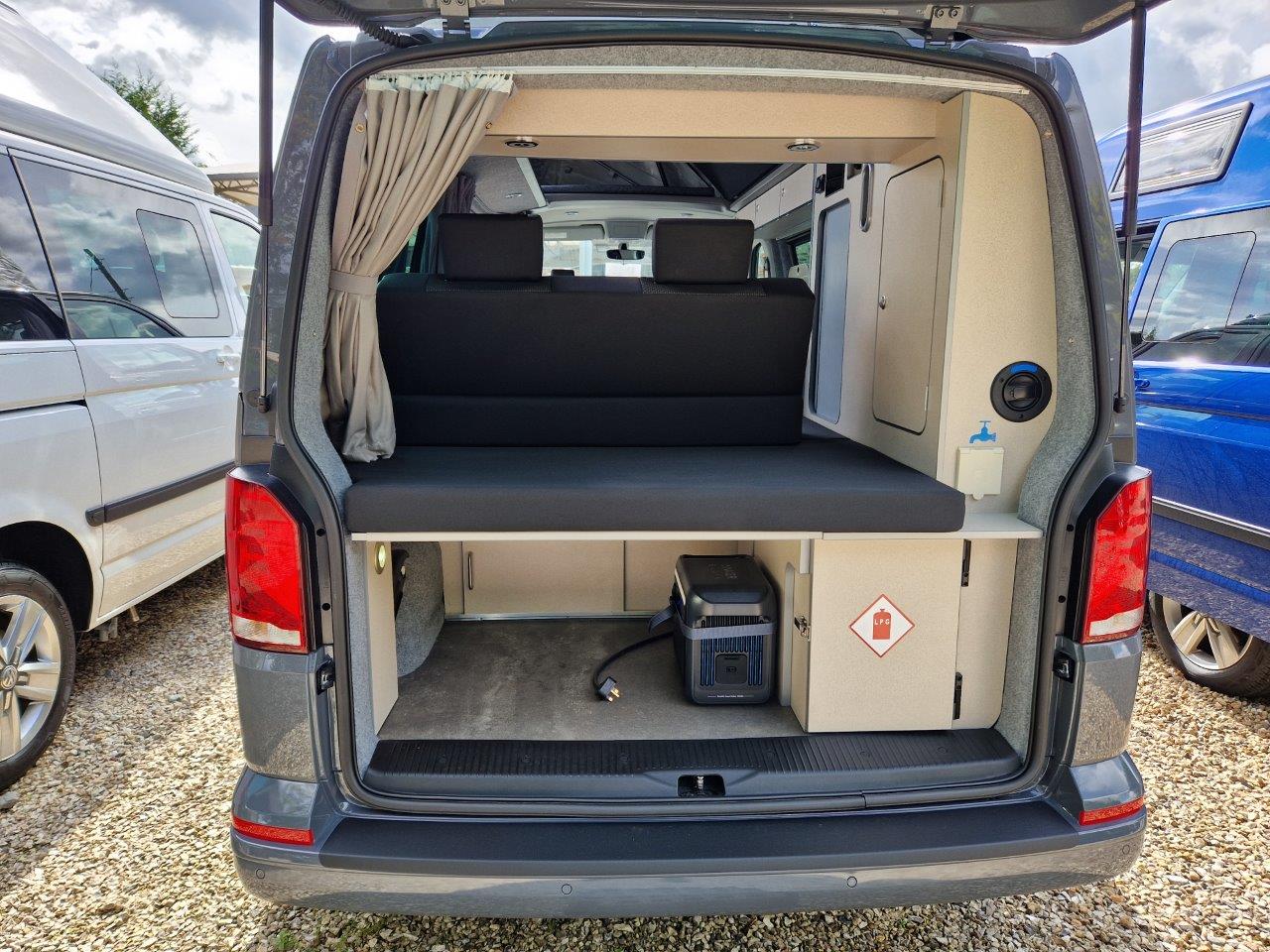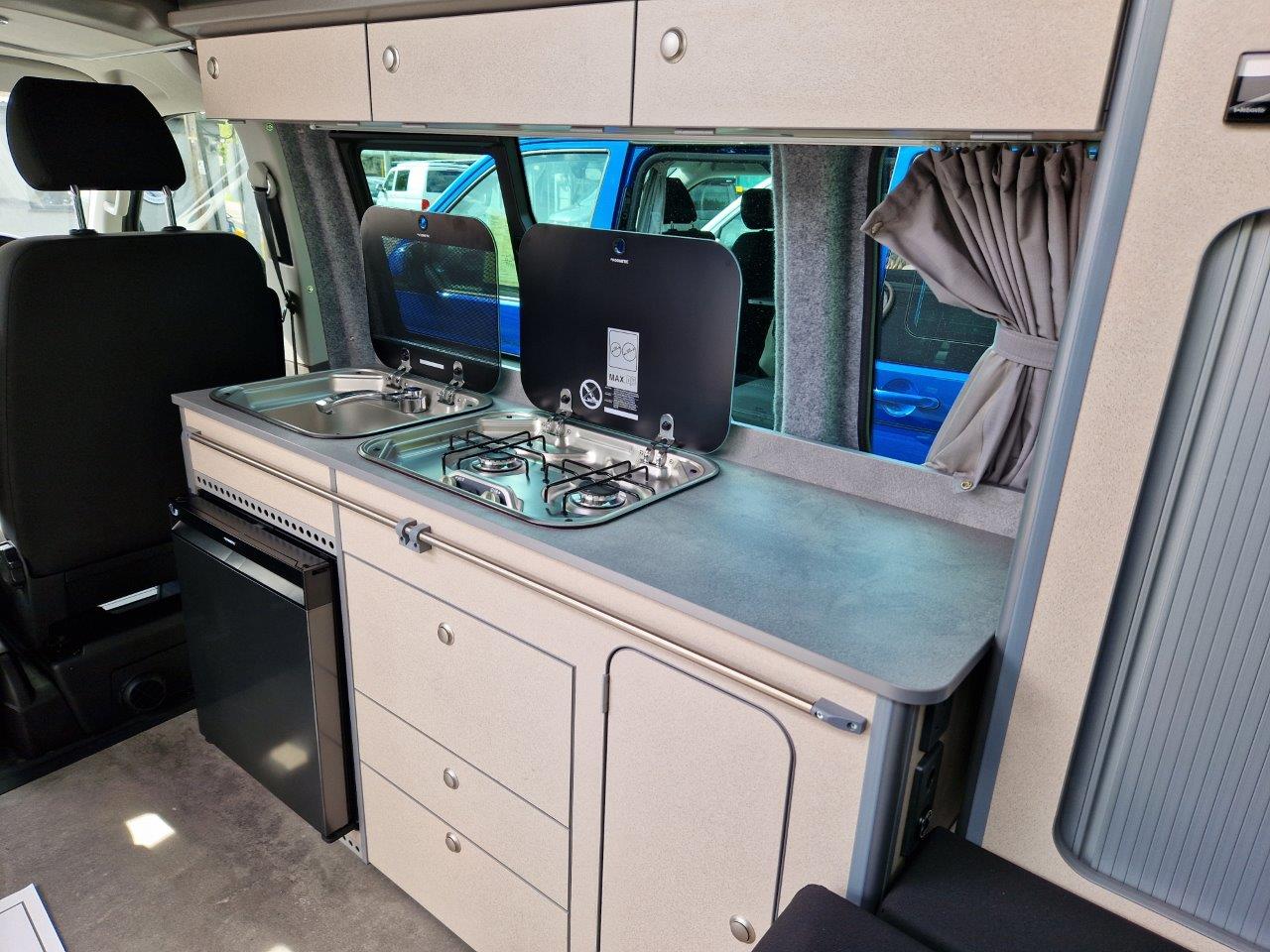 A new conversion built on the kombi base vehicle this is a classic style layout with side kitchen and rear bench seat making into a double bed, the kitchen includes a 65ltr compressor fridge with freezer compartment, 2-burner hob, sink, fresh & waste water tanks, leisure battery, mains hook up and storage drawers with a cutlery tray and additional storage and work space in this long wheel base, useful mini lockers over the kitchen units, a rear wardrobe, shelving area , storage under the bed/seat unit and at the rear of the vehicle. The bench seat with headrests and seat belts makes up very quickly into a 6'3" x 4'41/2" double.