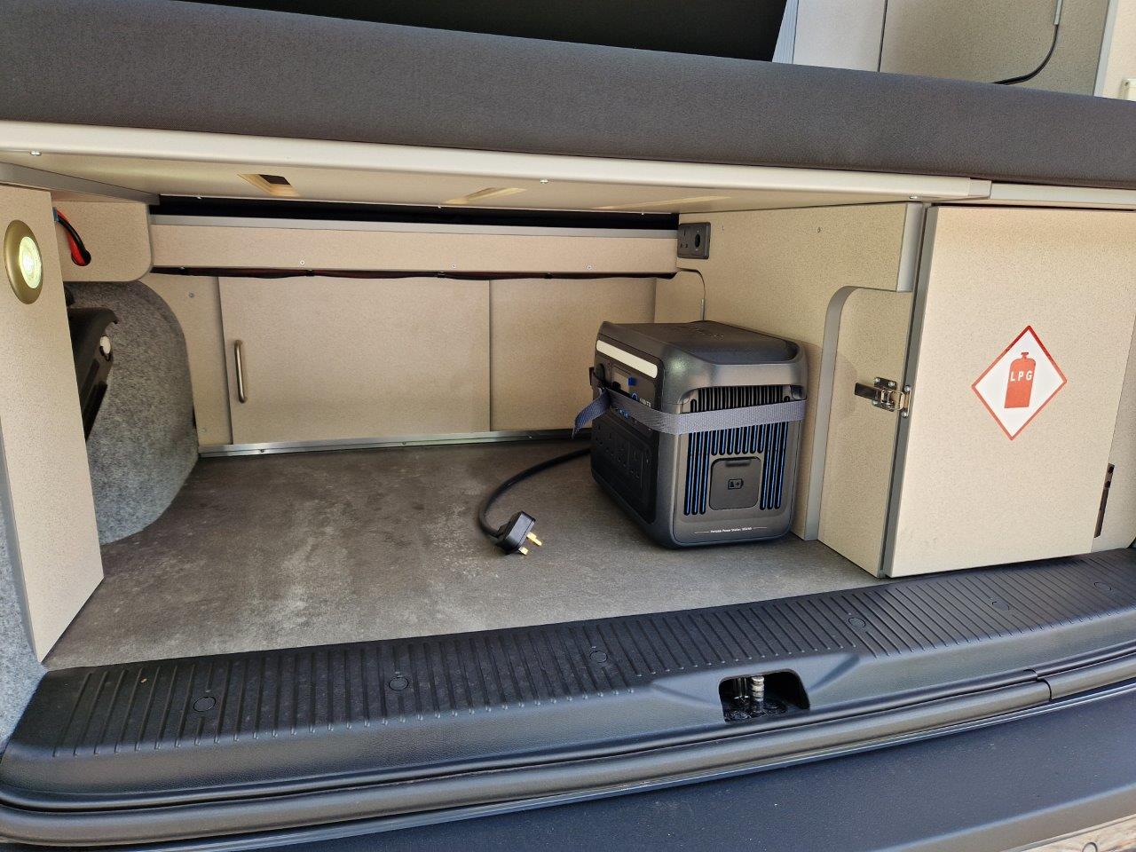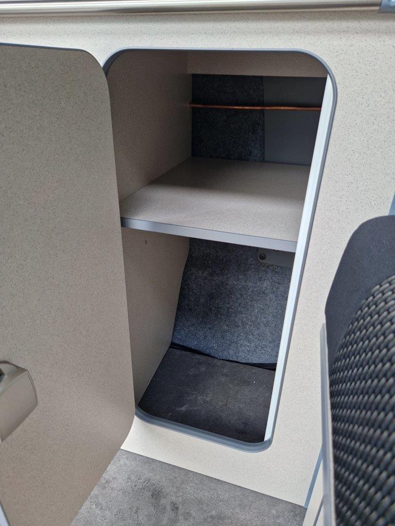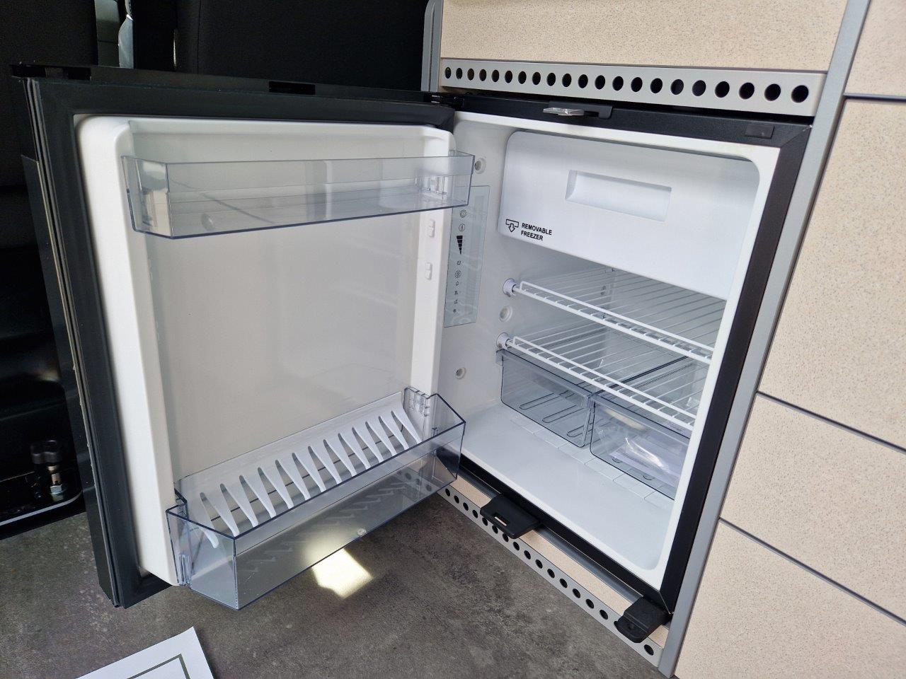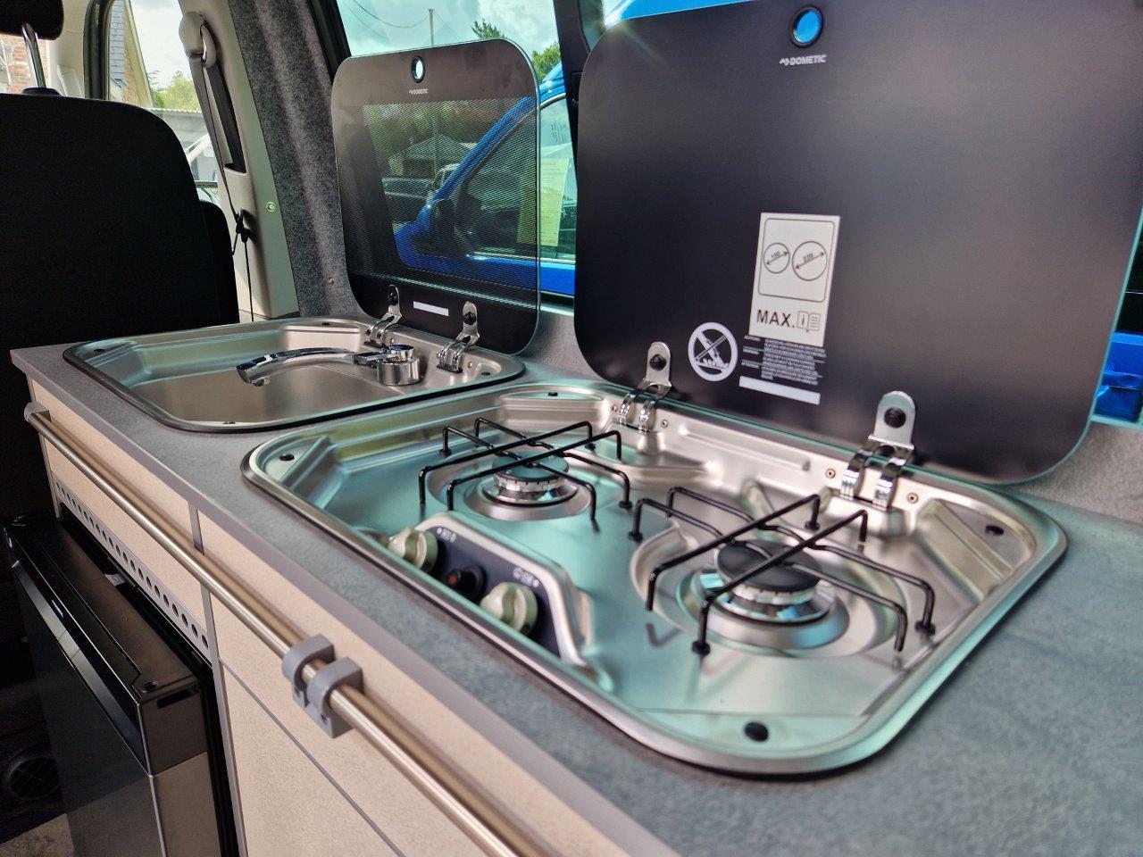 A new conversion built on the kombi base vehicle this is a classic style layout with side kitchen and rear bench seat making into a double bed, the kitchen includes a 65ltr compressor fridge with freezer compartment, 2-burner hob, sink, fresh & waste water tanks, leisure battery, mains hook up and storage drawers with a cutlery tray and additional storage and work space in this long wheel base, useful mini lockers over the kitchen units, a rear wardrobe, shelving area , storage under the bed/seat unit and at the rear of the vehicle. The bench seat with headrests and seat belts makes up very quickly into a 6'3" x 4'41/2" double.