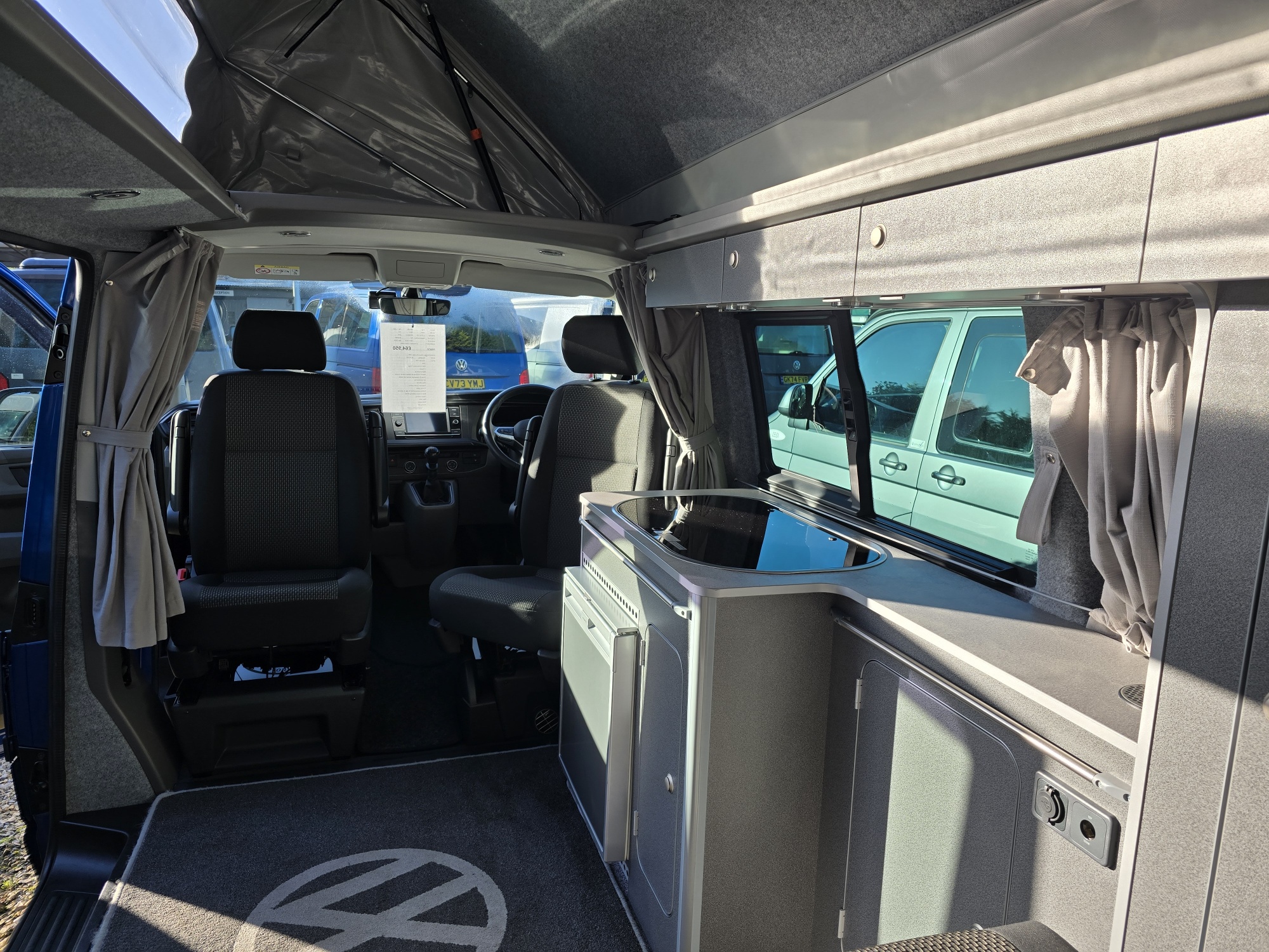 Features include air conditioning, metallic paint, alloy wheels, multi function leather steering wheel, adaptive cruise control, privacy glass, front & rear parking sensors, rear view camera, front fog & cornering lights, lights & vision pack, heated windscreen, diesel heating, awning rail, solar panel, roof rails, bike rack, front & rear removable carpet, wireless charge pad, activity shower, city emergency braking, trip computer, Bluetooth, DAB 6.5” touchscreen radio with App connect, Cat 1 Alarm, driver & passenger cab swivel seats with armrests, electric cab windows, electric adjustable heated folding mirrors, deadlock central locking, driver & passenger air bags, colour coded roof bumpers & mirror housings, 2 opening rear windows and cab comfort pack.