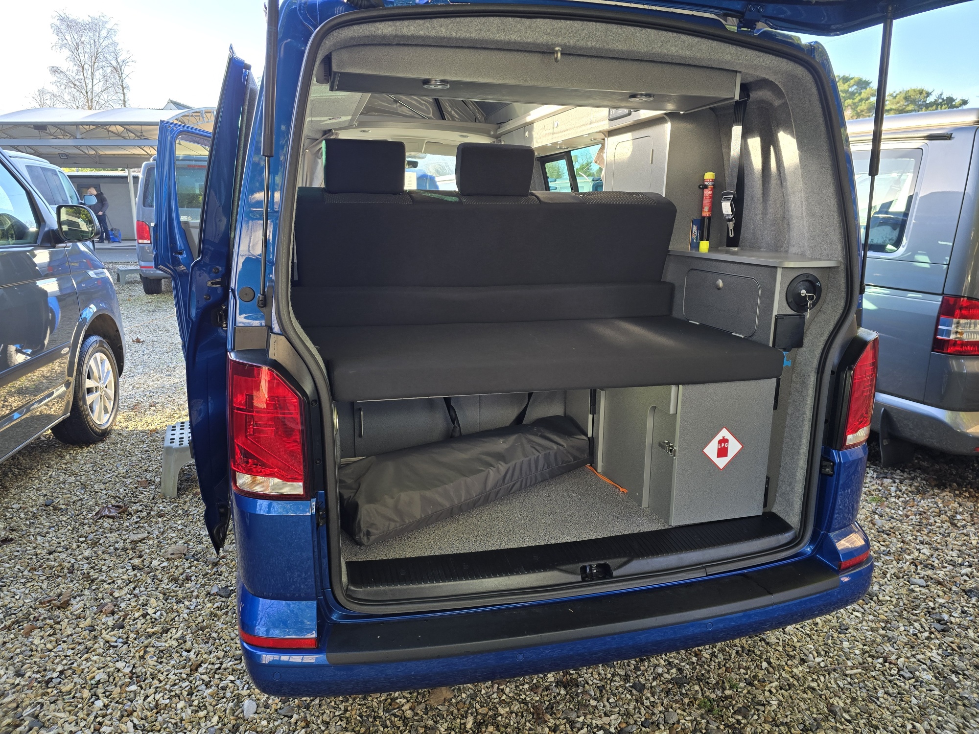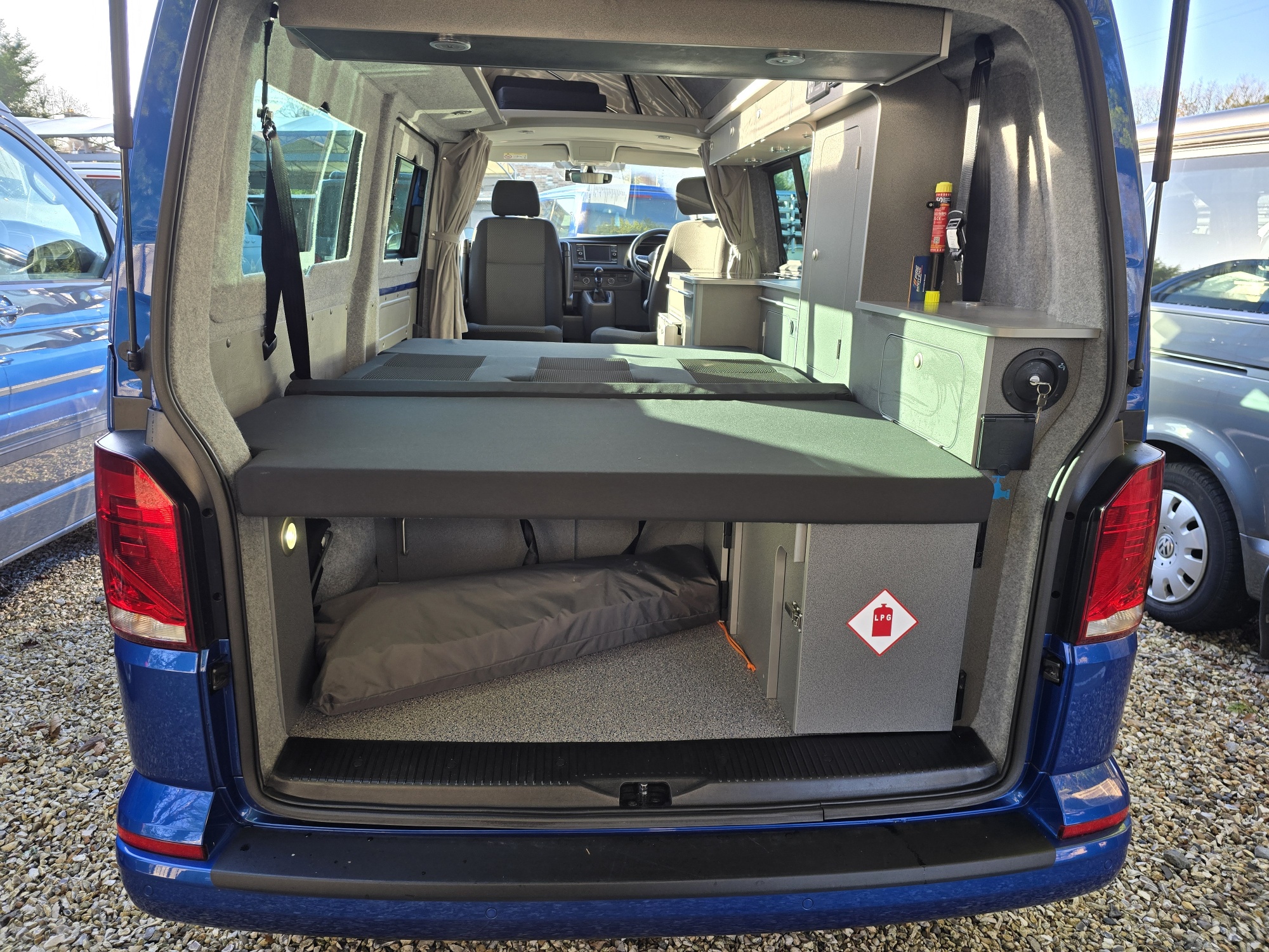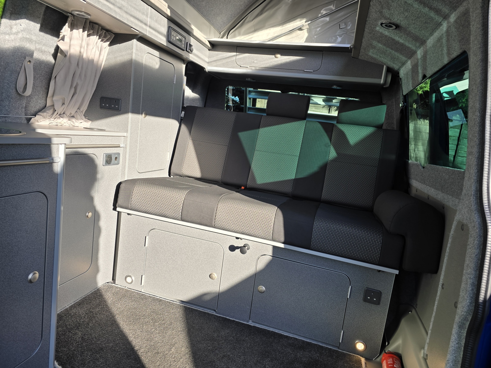 Built on the kombi base the Komba is an ideal every day vehicle with the option of driving away for the weekend and being self contained. The kitchen facilities are fitted along one side with a 65ltr compressor fridge, 3-burner hob, sink, fresh & waste water tanks, leisure battery, mains hook up and storage cupboard. The long wheel base has additional storage, work surface and floor space together with mini-lockers over the cooking area and beneath the bench seat. The seat is fixed across the rear of the vehicle and fitted with seat belts and head rests which can then make into a large double bed within seconds. Roof beds optional