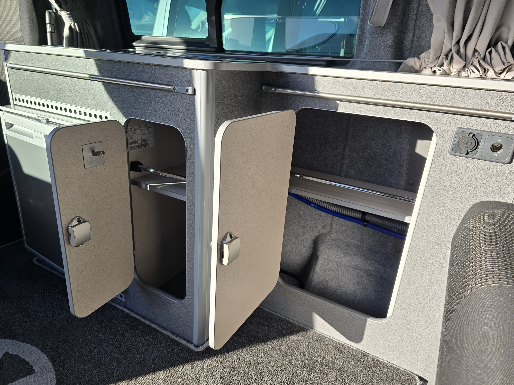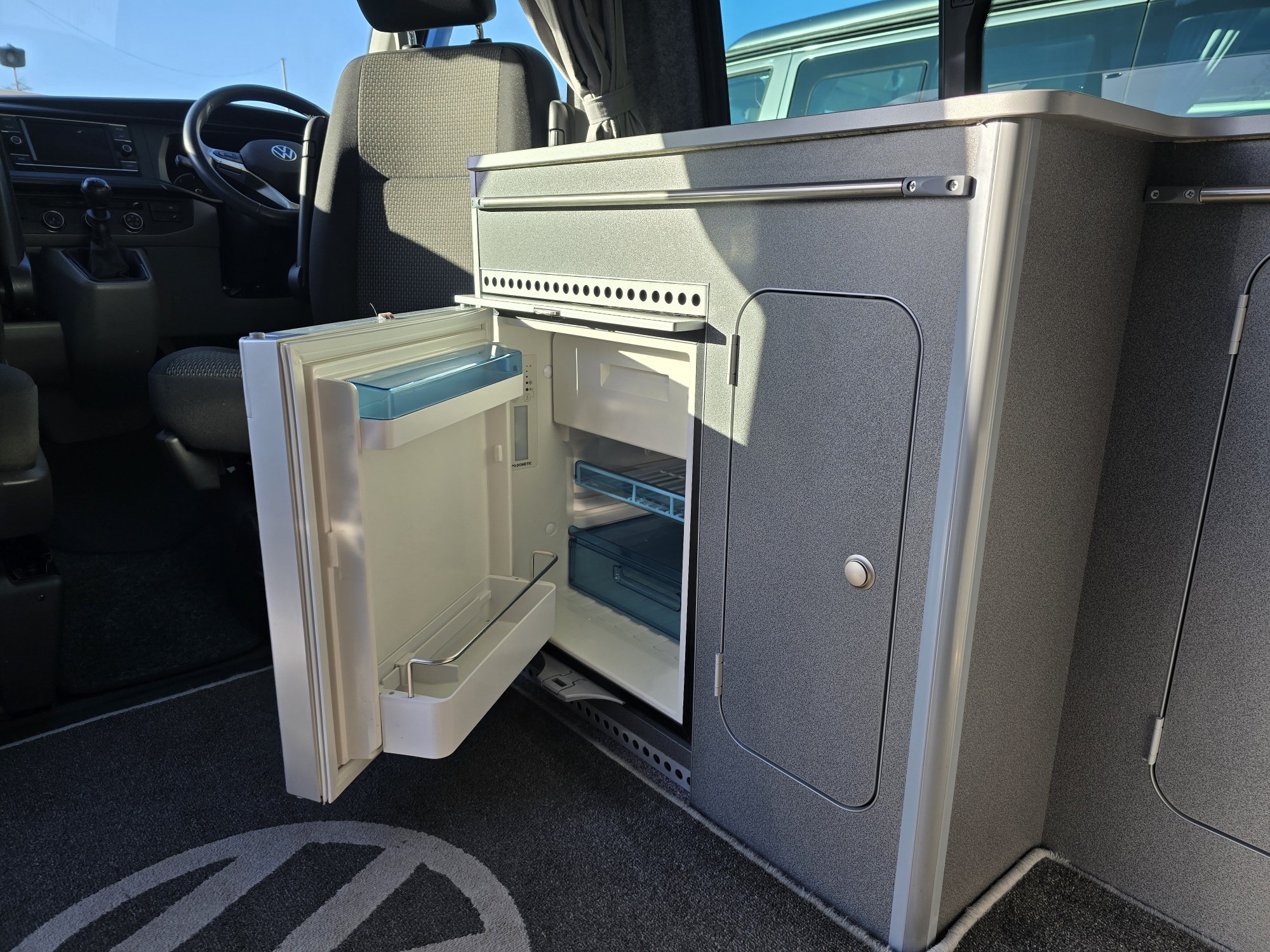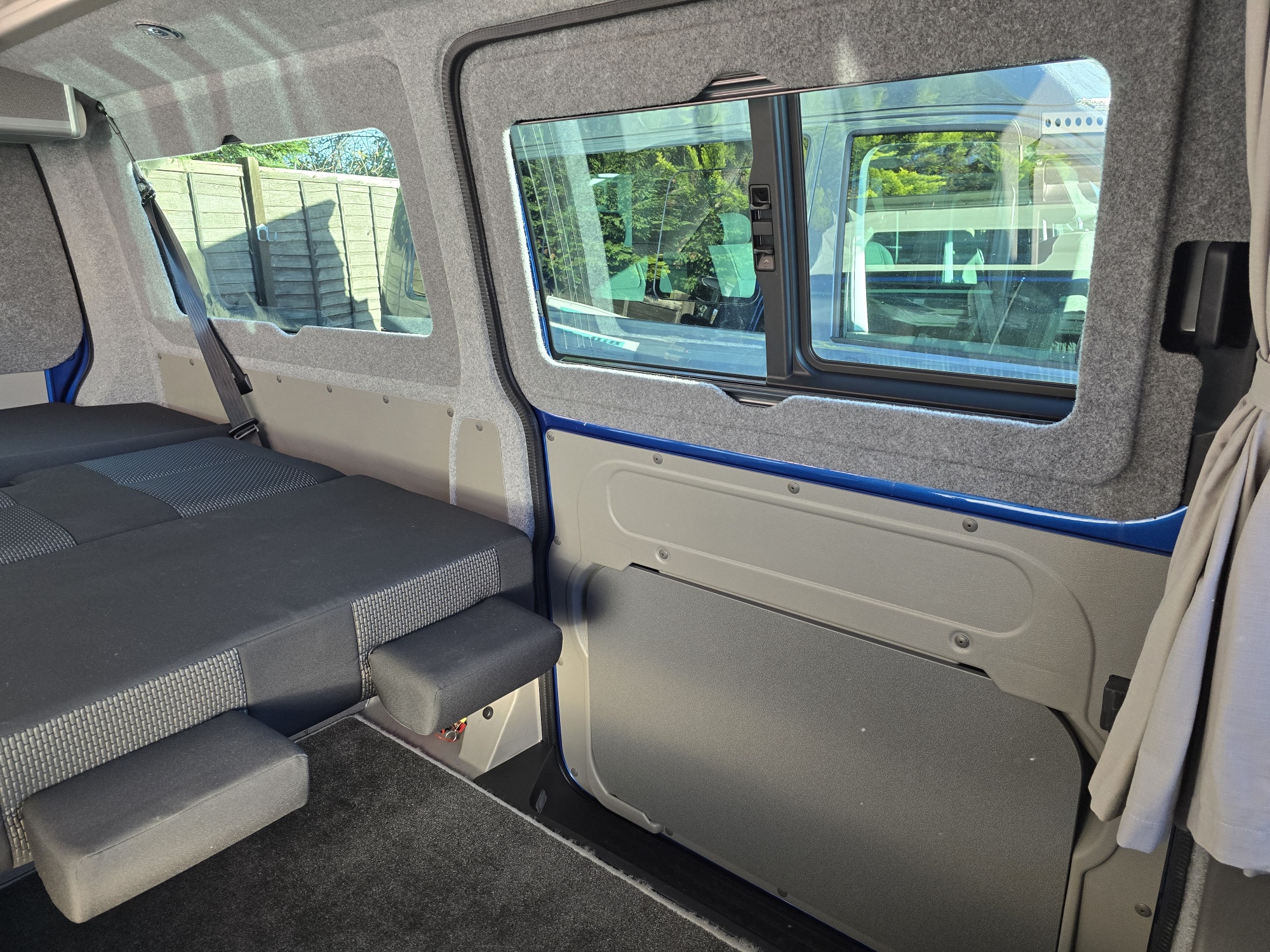 Built on the kombi base the Komba is an ideal every day vehicle with the option of driving away for the weekend and being self contained. The kitchen facilities are fitted along one side with a 65ltr compressor fridge, 3-burner hob, sink, fresh & waste water tanks, leisure battery, mains hook up and storage cupboard. The long wheel base has additional storage, work surface and floor space together with mini-lockers over the cooking area and beneath the bench seat. The seat is fixed across the rear of the vehicle and fitted with seat belts and head rests which can then make into a large double bed within seconds. Roof beds optional
