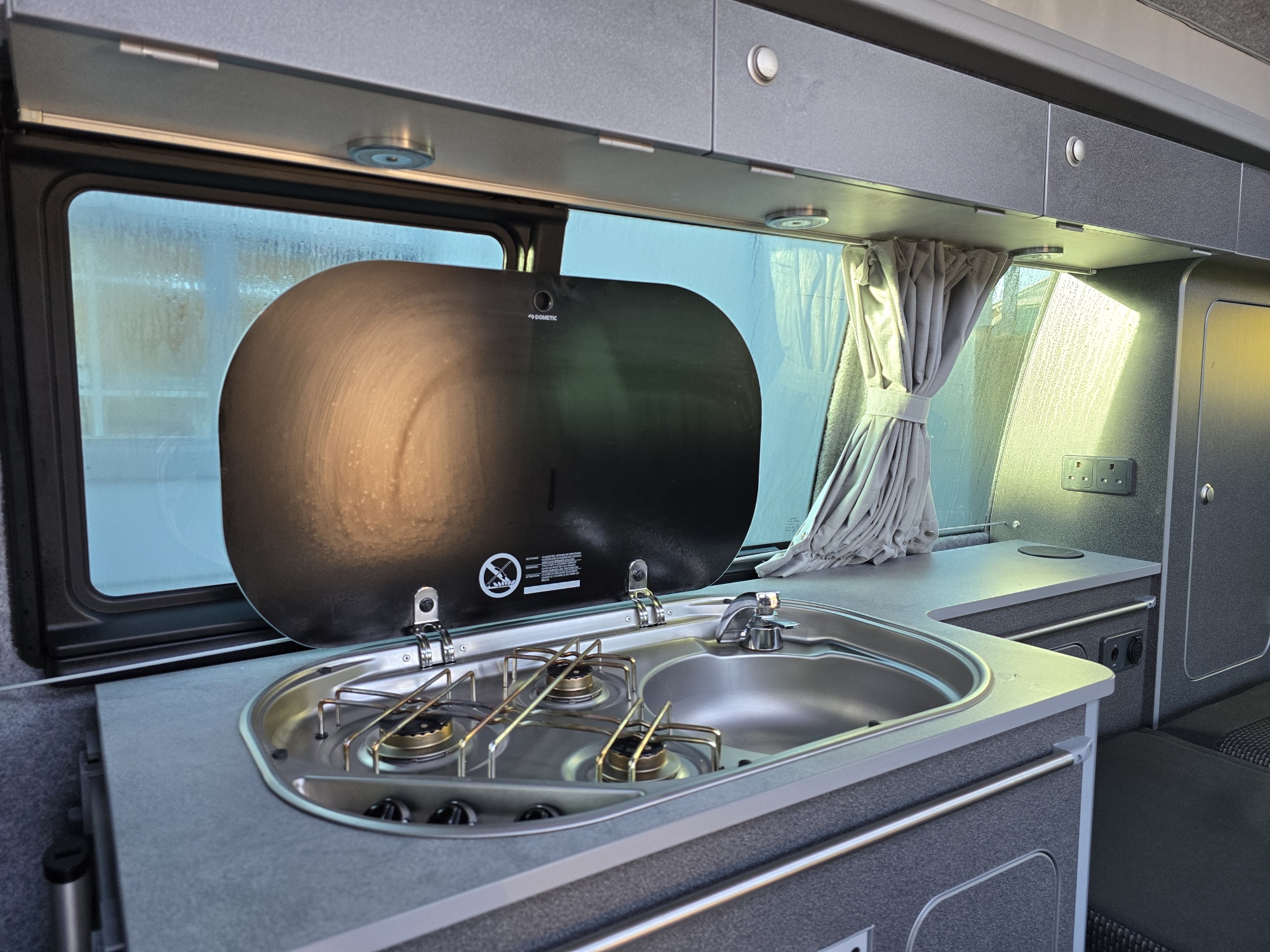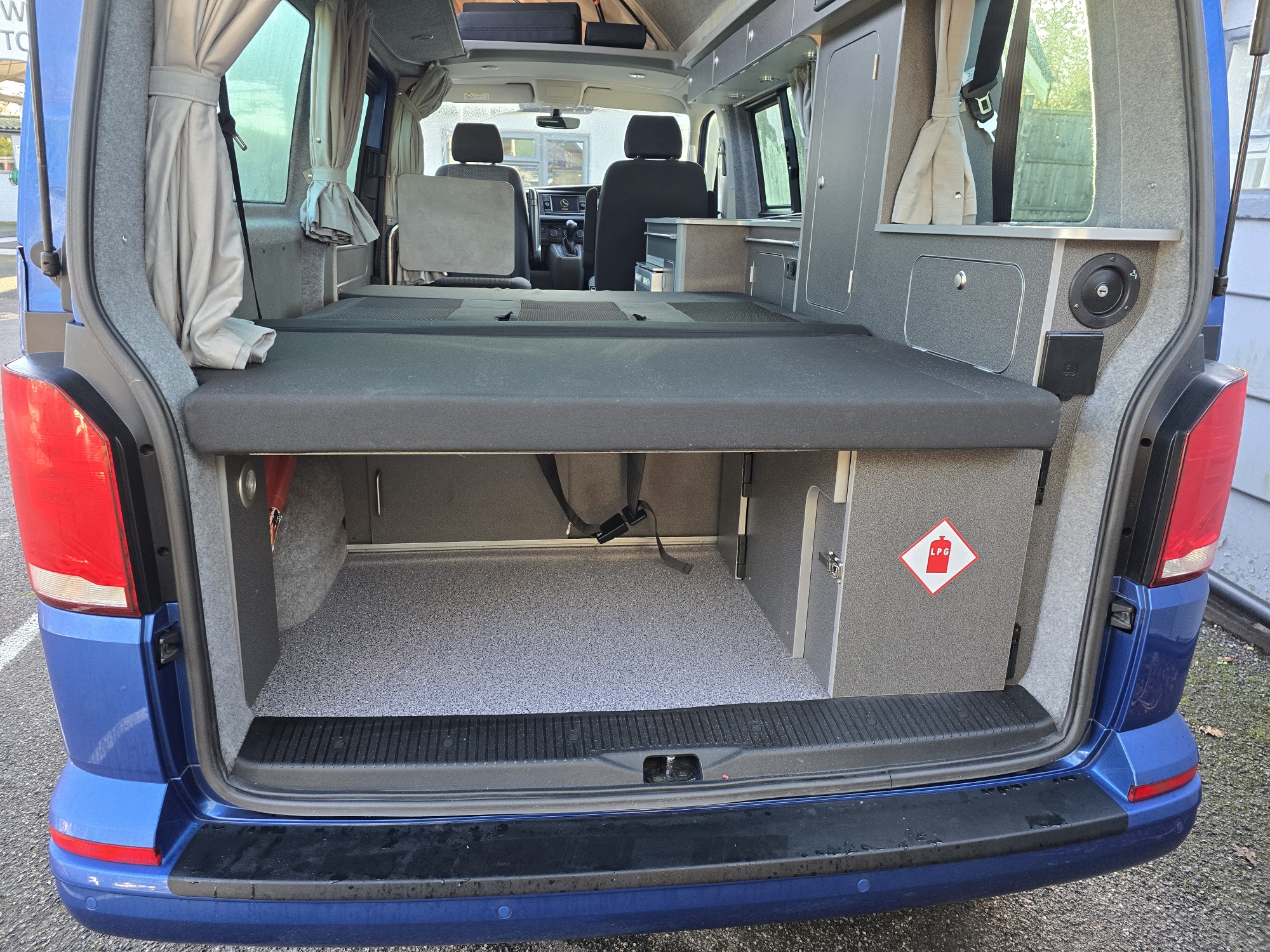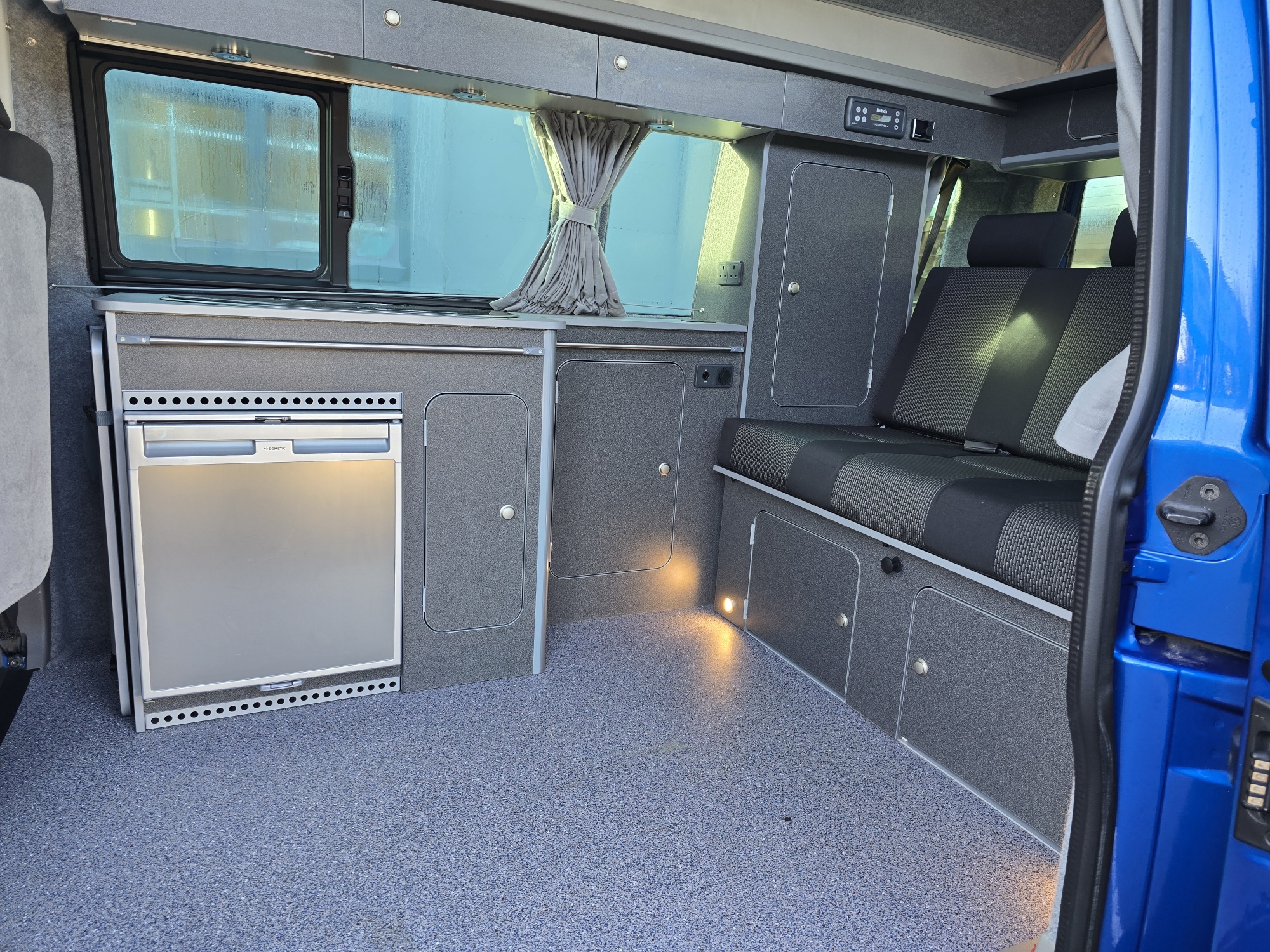 Built on the kombi base the Komba is an ideal every day vehicle with the option of driving away for the weekend and being self contained. The kitchen facilities are fitted along one side with a 65ltr compressor fridge, 3-burner hob, sink, fresh & waste water tanks, leisure battery, mains hook up and storage cupboard. The long wheel base has additional storage, work surface and floor space together with mini-lockers over the cooking area and beneath the bench seat. The seat is fixed across the rear of the vehicle and fitted with seat belts and head rests which can then make into a large double bed within seconds. Roof beds optional