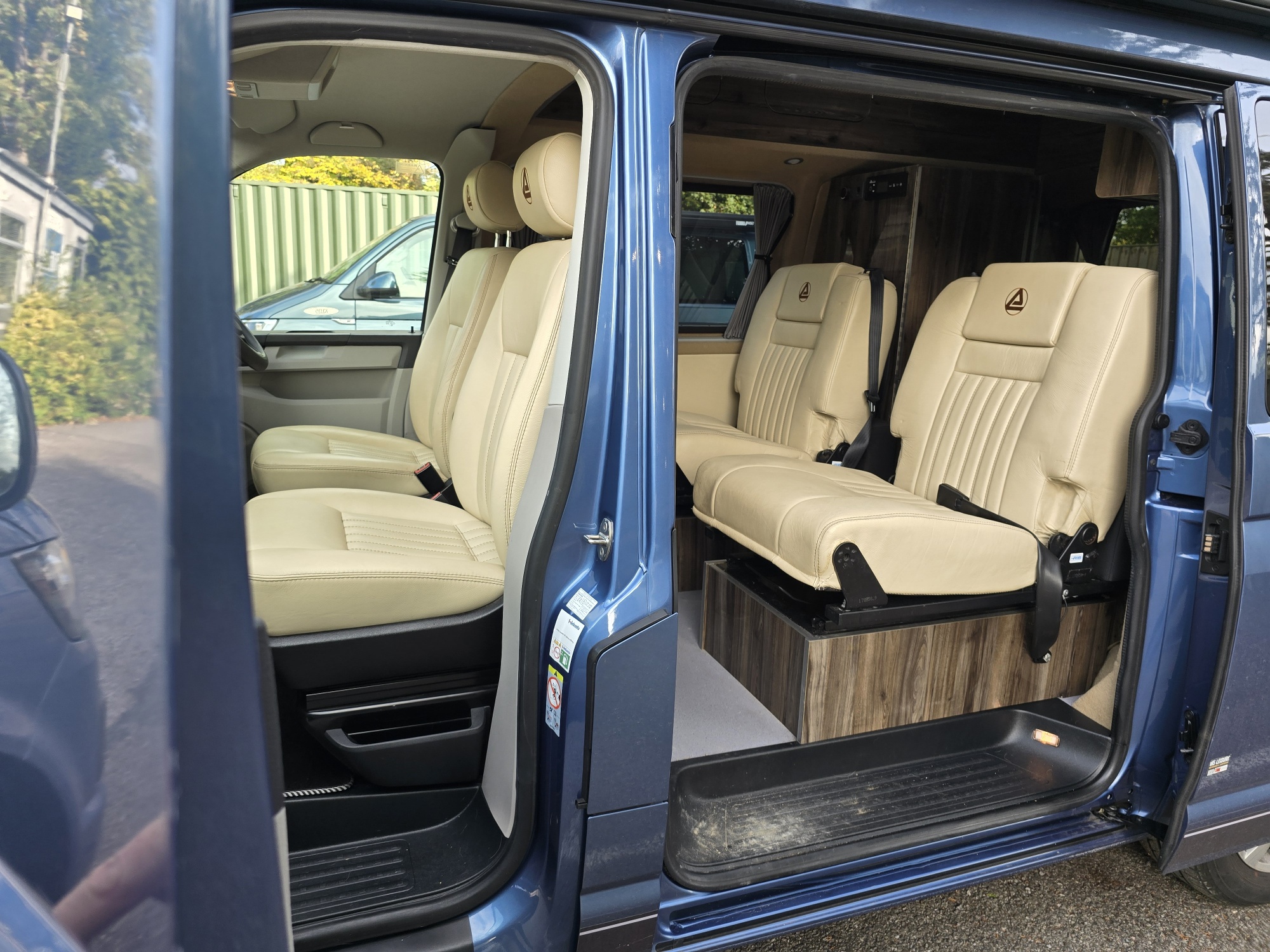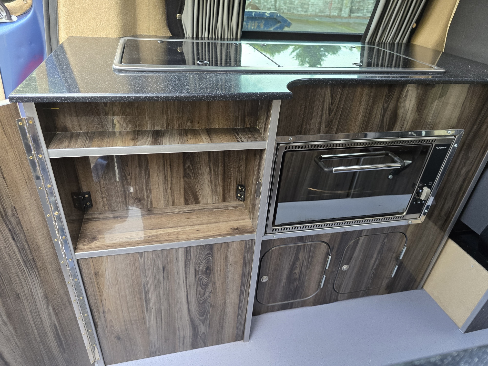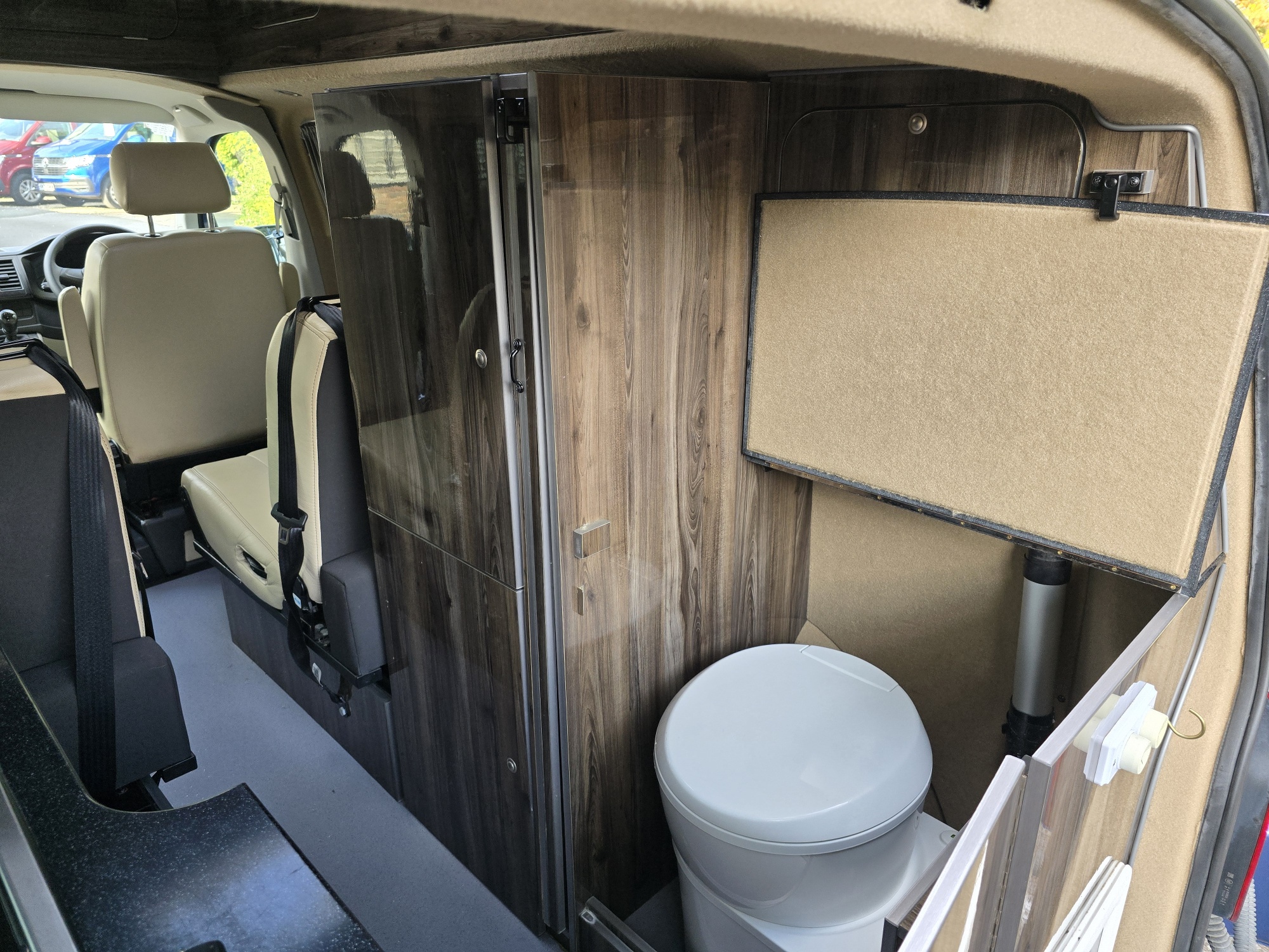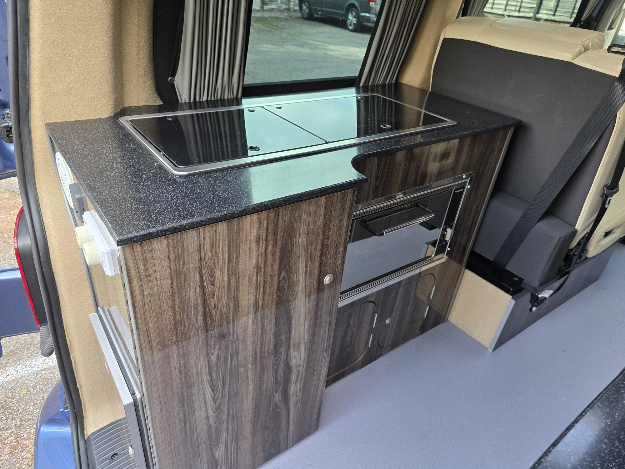 A rear galley kitchen style camper with 2 burner hob, sink, grill / oven, 50ltr compressor fridge, leisure battery, mains hook up, wardrobe and storage lockers. The rear 3-point belted seats with head rests and storage beneath, fold flat and combined with the swiveling cab seats create 2 single beds. The rear section can be zoned off for use of the fixed cassette toilet