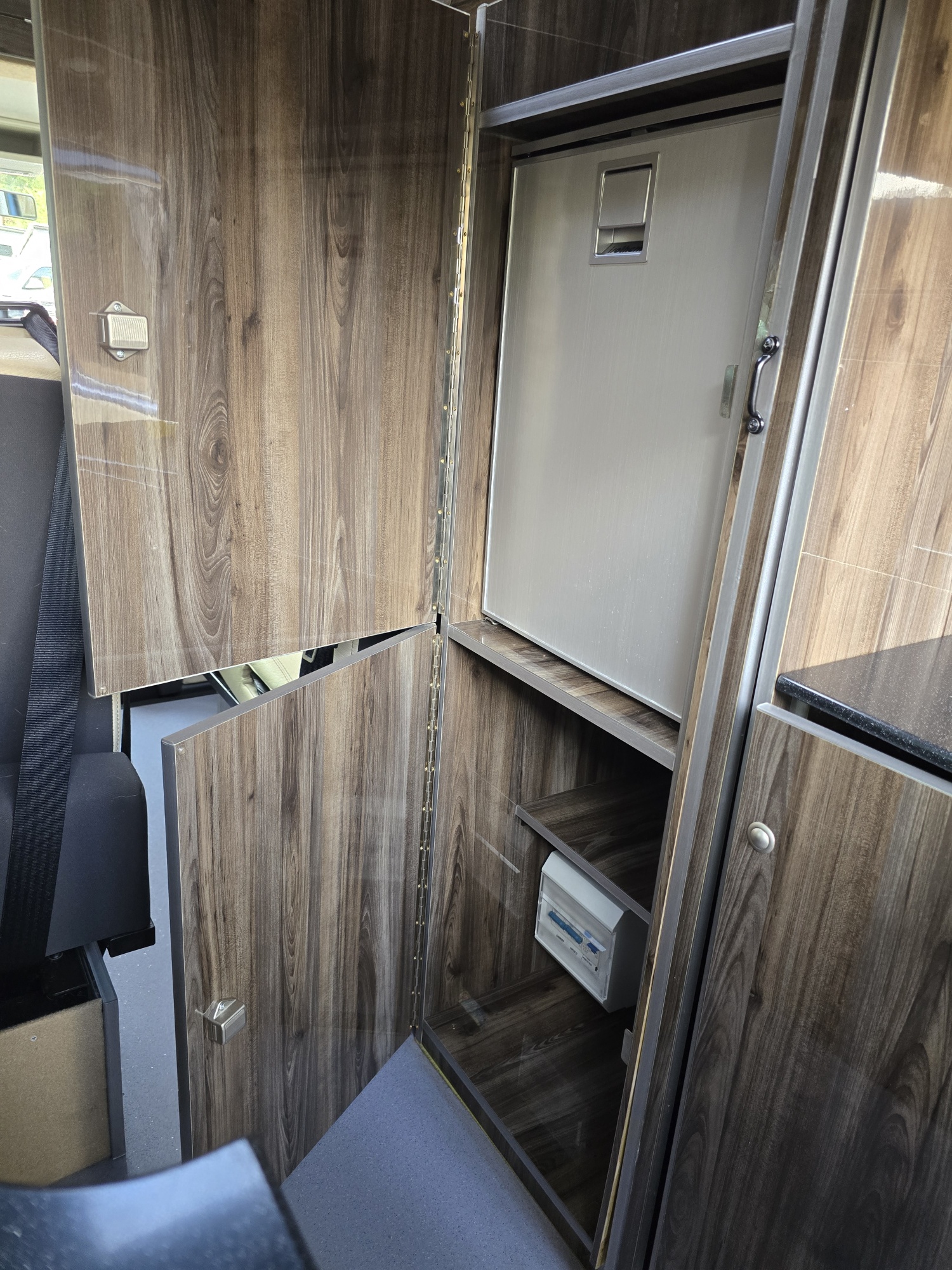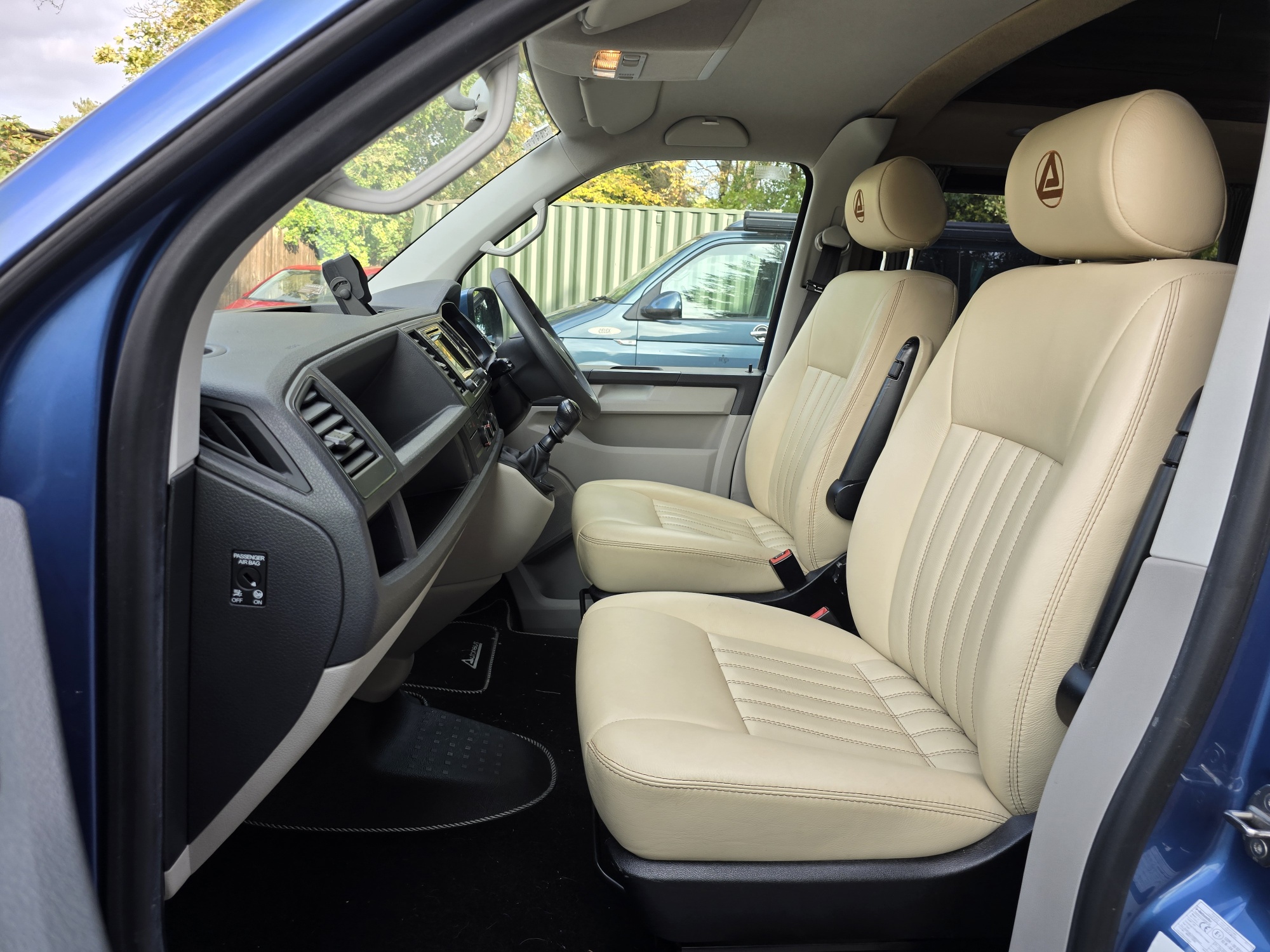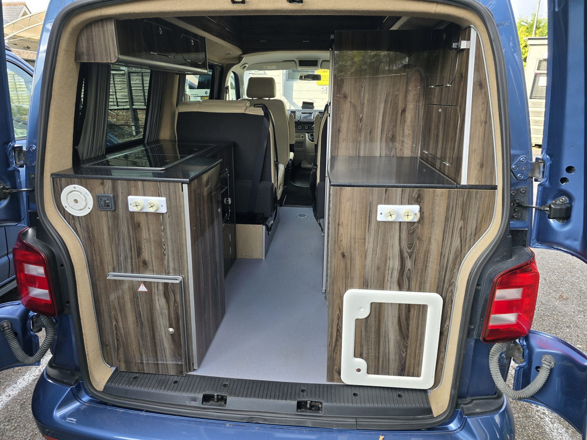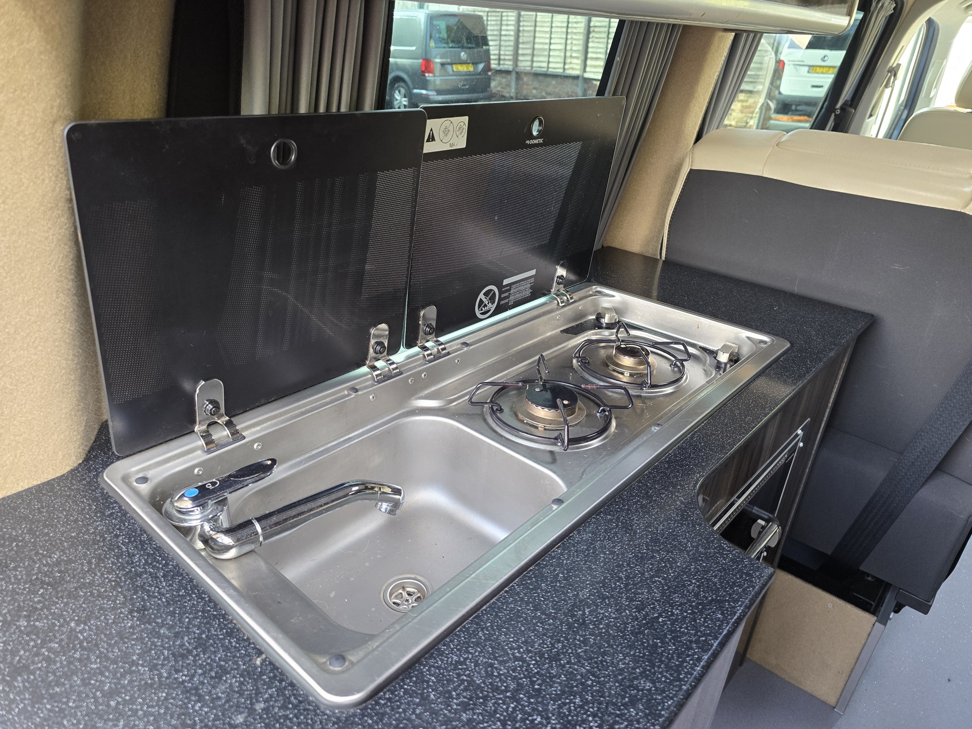 A rear galley kitchen style camper with 2 burner hob, sink, grill / oven, 50ltr compressor fridge, leisure battery, mains hook up, wardrobe and storage lockers. The rear 3-point belted seats with head rests and storage beneath, fold flat and combined with the swiveling cab seats create 2 single beds. The rear section can be zoned off for use of the fixed cassette toilet