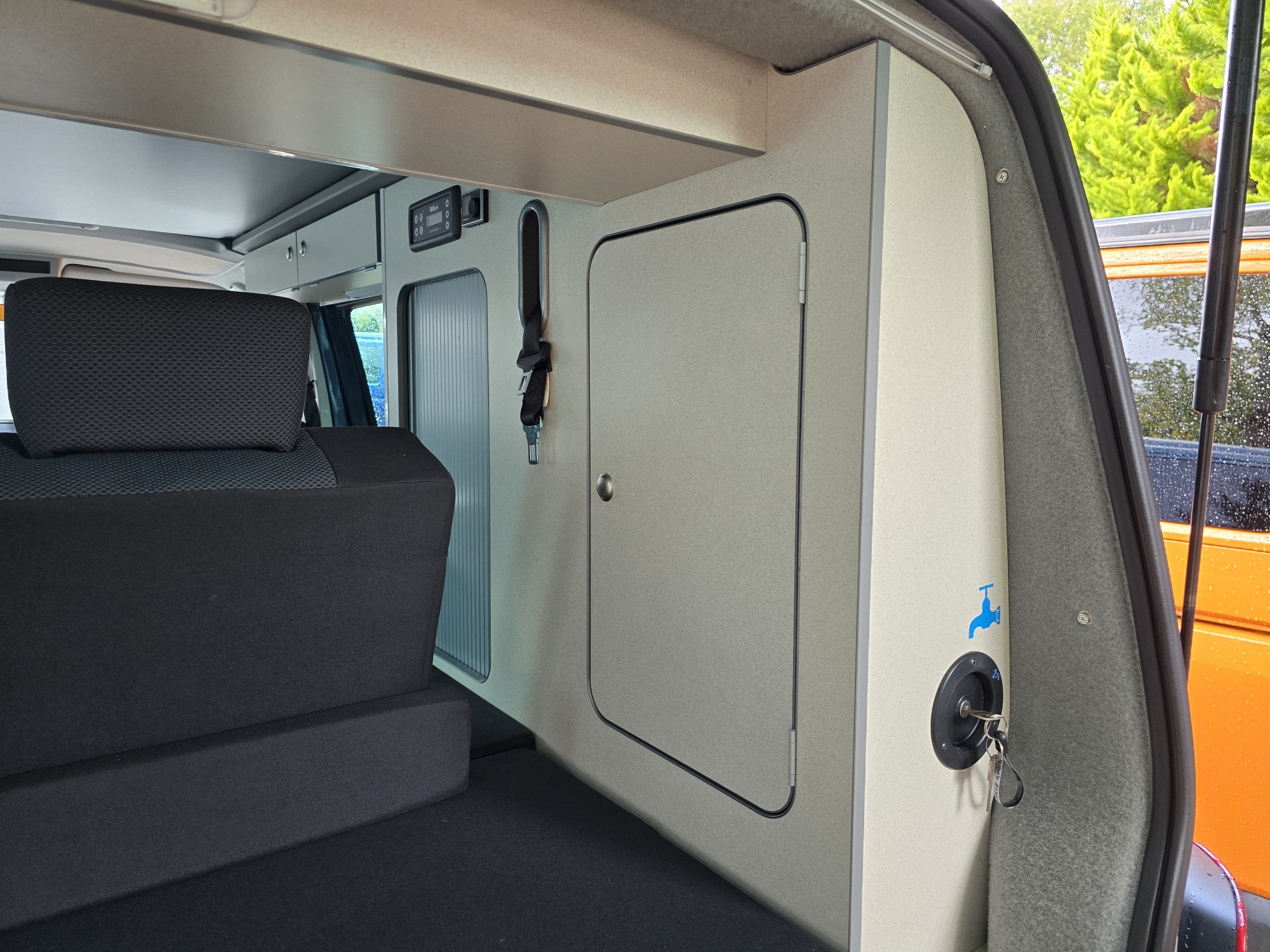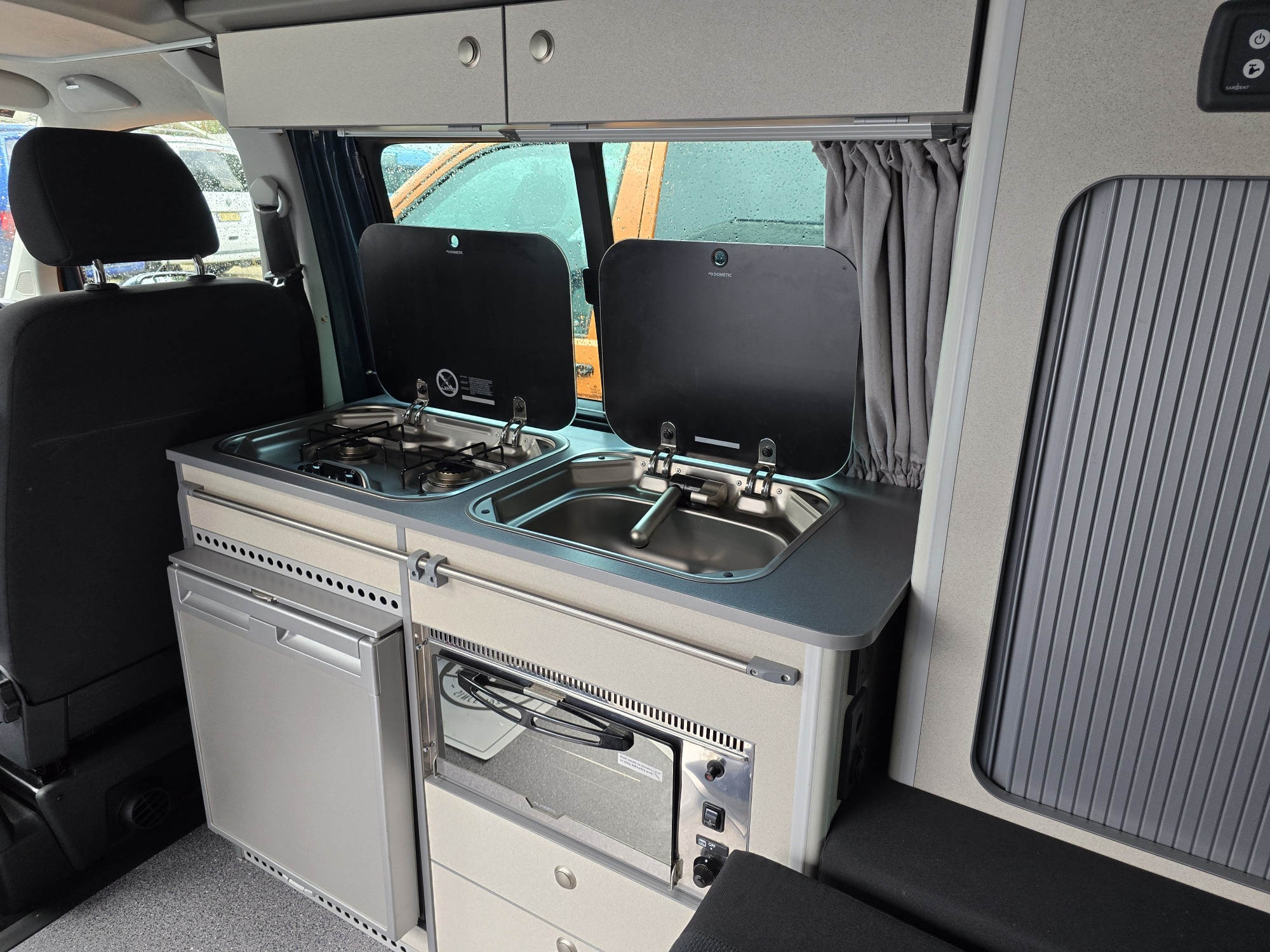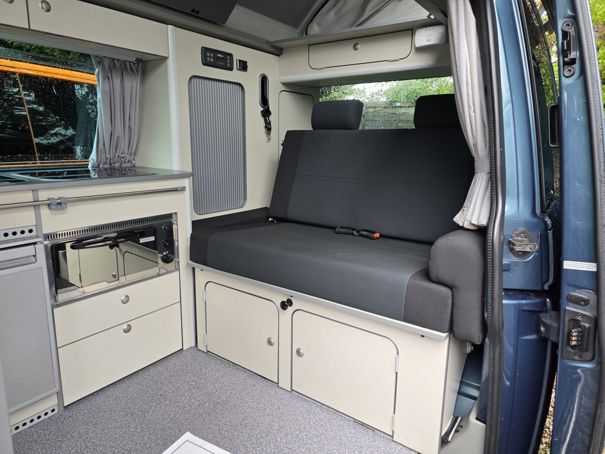 Built on the window van base vehicle this is a classic style layout with side kitchen and rear bench seat making into a double bed. The kitchen includes a 65ltr compressor fridge with freezer compartment, 2-burner hob, sink, warming oven / grill, fresh & waste water tanks, leisure battery, mains hook up and storage drawers with a cutlery tray, useful mini lockers over the kitchen units, a rear wardrobe and shelving area and storage under the bed/seat unit and at the rear of the vehicle. The bench seat with head rests & seat belts makes up very quickly into a 6'3" x 4'41/2" double.