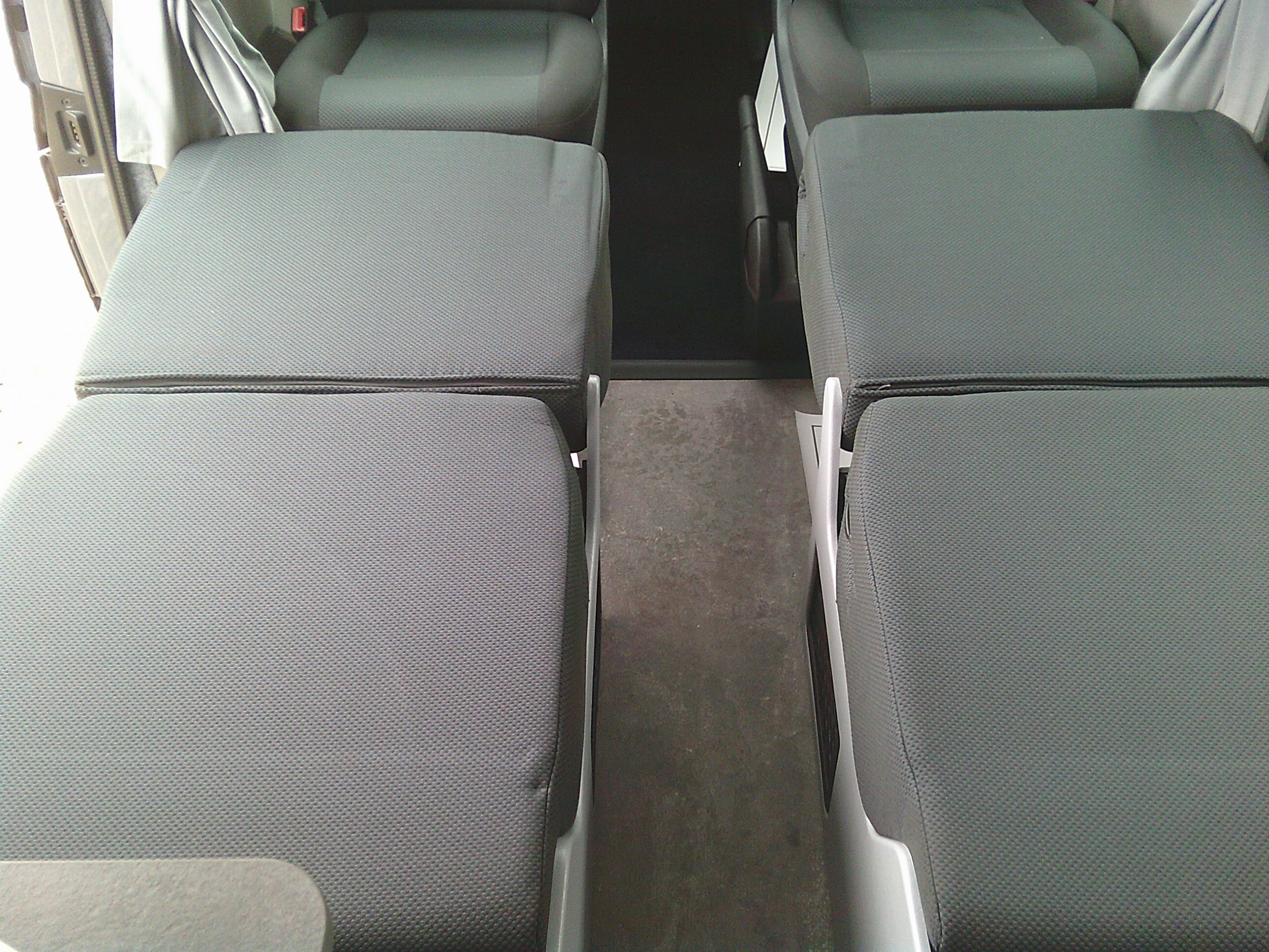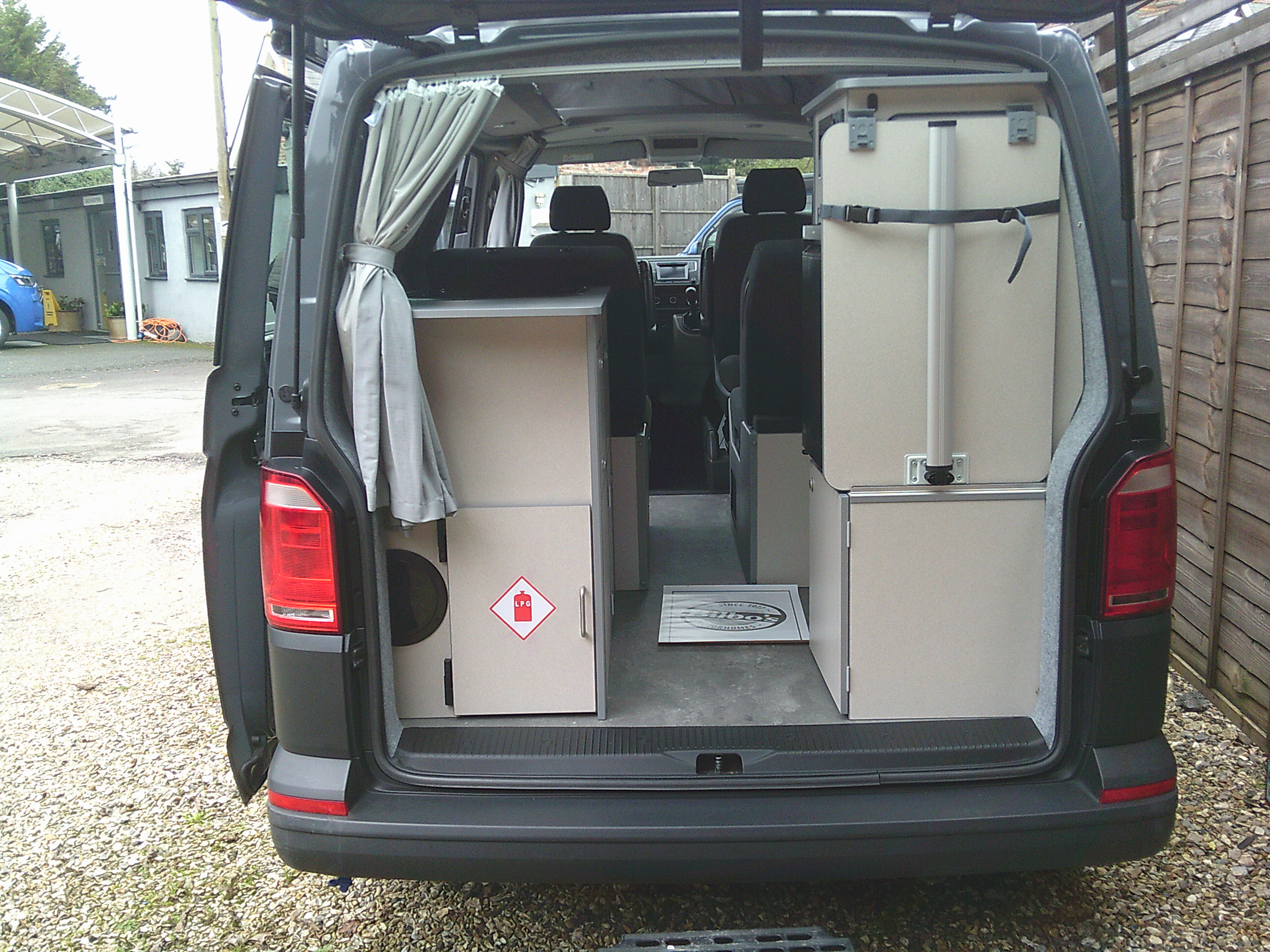 A recently converted example built on the window van base vehicle this is a rear galley kitchen style camper with 3 burner hob, sink, 50ltr compressor fridge, fresh & waste water tanks, leisure battery, mains hook up, wardrobe and storage drawers. The rear 3-point belted seats with head rests and storage beneath, fold flat and combined with the swiveling cab seats create 2 single beds. The rear section can be zoned off for use of the standard 565 porta potti. Roof beds optional