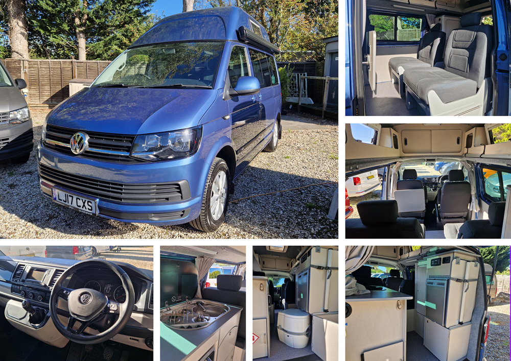 Built on the window van base vehicle this is a rear galley kitchen style camper with 3 burner hob, sink, microwave, 50ltr compressor fridge, fresh & waste water tanks, leisure battery, mains hook up, wardrobe and storage drawers. The rear 3-point belted seats with head rests and storage beneath, fold flat and combined with the swiveling cab seats create 2 single beds. The rear section can be zoned off for use of the standard 465 porta potti.